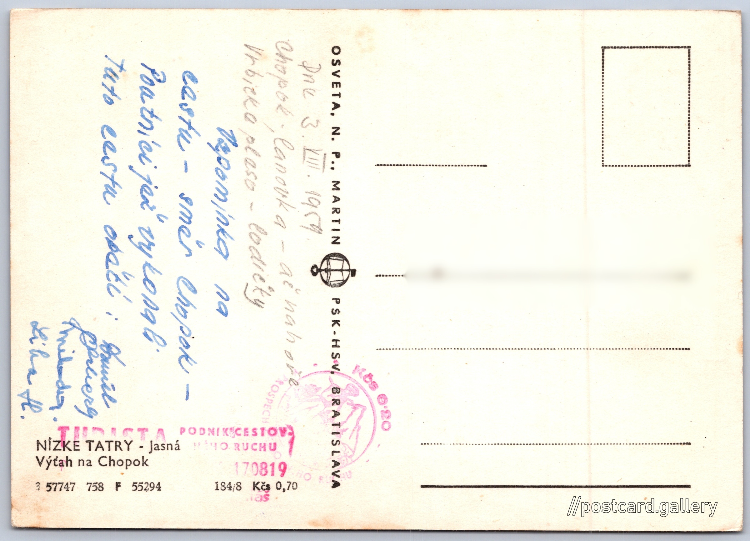 Nízké Tatry, lanovka na Chopok Pokud chcete vidět pohlednice ve vyšším rozlišení nebo zobrazovat jejich zadní stranu, tak se prosím nejdříve přihlašte Přihlásit Zaregistrovat NÍZKE TATRY - JasnáVýťah na Chopok Jazyk tištěného textu na pohlednici: slovenština Demänovská Dolina ukázat na mapě Vydavatel: Osveta, n. p., Martin PŠK - Bratislava (Československo) Rok vydání pohlednice: červenec, 1958 Velikost (š x v) a tvar pohlednice: 146 x 104 mm (5.75" x 4.09"), obdélník Prošlá poštou:Datum napsání pohledu: 3.8.1959 Ceny: Cena pohlednice: 0,70 Kčs (CSK) Kódy na pohlednici: 3 57747 758 F 55294 184/8 DiskuseVložit příspěvek Přidat novou složku ... Spravovat složky ...