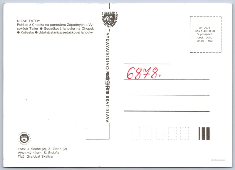 Nízké Tatry Pokud chcete vidět pohlednice ve vyšším rozlišení nebo zobrazovat jejich zadní stranu, tak se prosím nejdříve přihlašte Přihlásit Zaregistrovat Interhotel RužomberokČedok NÍZKE TATRY- Pohľad z Chopka na panorámu Západných a Vysokých Tatier- Sedačková lanovka na Chopok- Koliesko- Údolná stanica sedačkovej lanovky Jazyk tištěného textu na pohlednici: slovenština Demänovská Dolina ukázat na mapě Vydavatel: PressFoto Bratislava (Československo) Rok vydání pohlednice: 1985 Velikost (š x v) a tvar pohlednice: 147 x 105 mm (5.79" x 4.13"), obdélník Osoby spjaté s touto pohlednicí: S. Štubňa(Design pohlednice) Z. Zibrin(Autor fotografie) Josef Šechtl(Autor fotografie) Čistá pohlednice (neprošlá poštou) Ceny: Cena pohlednice: 1,40 Kčs (CSK) (+0,20 Kčs přípl. na tur. ruch) Kódy na pohlednici: 21-2076 2185-152 DiskuseVložit příspěvek Přidat novou složku ... Spravovat složky ...