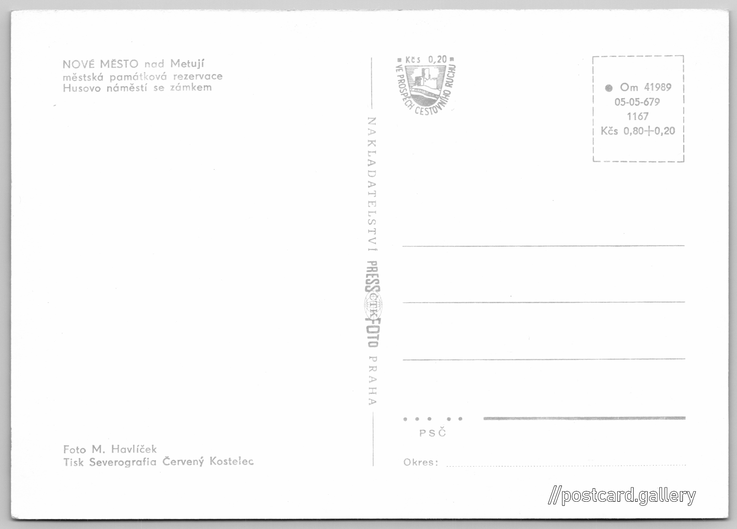 Nové Město nad Metují, Husovo náměstí 3/8 Pokud chcete vidět pohlednice ve vyšším rozlišení nebo zobrazovat jejich zadní stranu, tak se prosím nejdříve přihlašte Přihlásit Zaregistrovat NOVÉ MĚSTO nad Metujíměstská památková rezervaceHusovo náměstí se zámkem Jazyk tištěného textu na pohlednici: čeština Nové Město nad Metují, Město, Česko ukázat na mapě V blízkém okolí místa zobrazeného na pohlednici lze najít 8 jiných pohlednic. Zobrazit blízké pohlednice Vydavatel: PressFoto Praha (Československo) Rok vydání pohlednice: 1976 Velikost (š x v) a tvar pohlednice: 148 x 105 mm (5.83" x 4.13"), obdélník Osoby spjaté s touto pohlednicí: Jan Hus(Jméno v názvu místa) M. Havlíček(Autor fotografie) Čistá pohlednice (neprošlá poštou) Ceny: Cena pohlednice: 0,80 Kčs (CSK) (+0,20 Kčs přípl. na tur. ruch) Kódy na pohlednici: •Om 41989 05-05-679 1167 DiskuseVložit příspěvek Přidat novou složku ... Spravovat složky ...