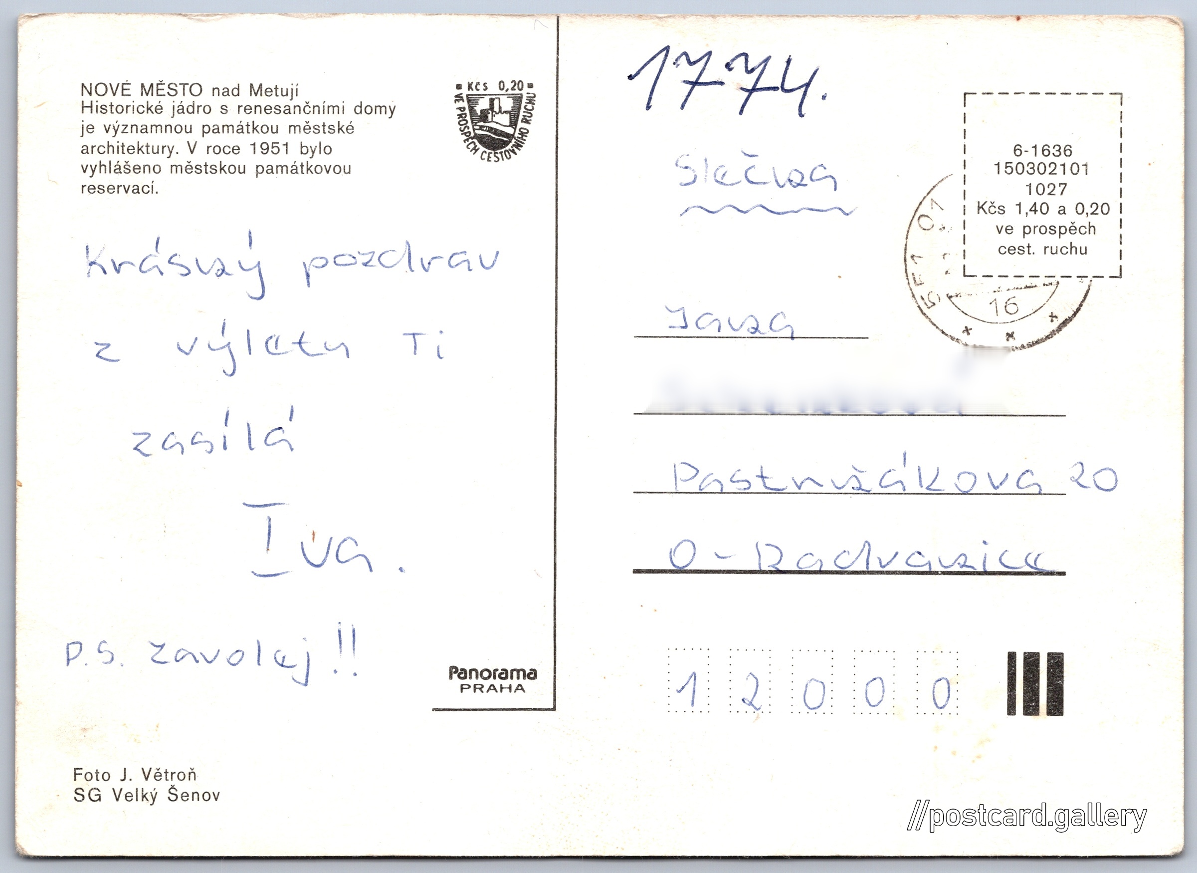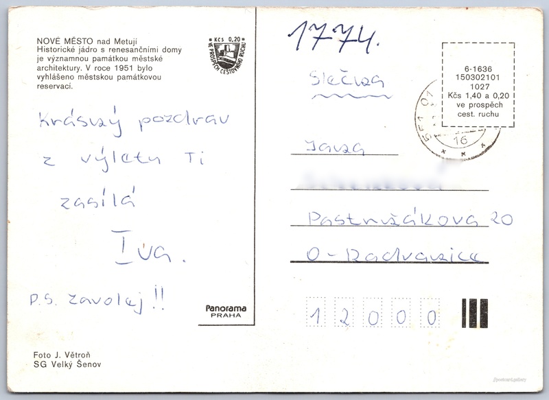 Nové město nad Metují Pokud chcete vidět pohlednice ve vyšším rozlišení nebo zobrazovat jejich zadní stranu, tak se prosím nejdříve přihlašte Přihlásit Zaregistrovat Nové město nad Metují NOVÉ MĚSTO nad MetujíHistorické jádro s renesančními domy je významnou památkou městské architektury. V roce 1951 bylo vyhlášeno městskou památkovou reservací. Jazyk tištěného textu na pohlednici: čeština Nové Město nad Metují, Náchod ukázat na mapě Vydavatel: Panorama (Československo) Datum vydání není známo Pomozte nám odhadnout datum vzniku pohlednice Velikost (š x v) a tvar pohlednice: 147 x 106 mm (5.79" x 4.17"), obdélník Osoby spjaté s touto pohlednicí: J. Větroň(Autor fotografie) Prošlá poštou Ceny: Cena pohlednice: 1,40 Kčs (CSK) (+0,20 Kčs přípl. na tur. ruch) Kódy na pohlednici: 6-1636 150302101 1027 DiskuseVložit příspěvek Přidat novou složku ... Spravovat složky ...