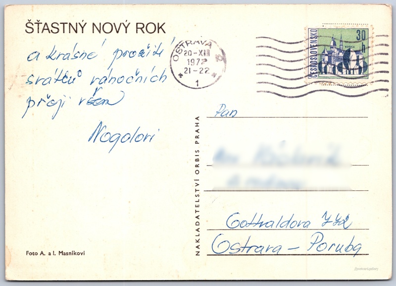 Novoroční přání Pokud chcete vidět pohlednice ve vyšším rozlišení nebo zobrazovat jejich zadní stranu, tak se prosím nejdříve přihlašte Přihlásit Zaregistrovat ŠŤASTNÝ NOVÝ ROK Jazyk tištěného textu na pohlednici: čeština Vydavatel: Nakladatelství Orbis (Československo) Odhadované datum vydání pohlednice: 1969 - 1972 Pomozte nám zpřesnit rok vzniku pohlednice Velikost (š x v) a tvar pohlednice: 148 x 105 mm (5.83" x 4.13"), obdélník Osoby spjaté s touto pohlednicí: A. Masníková(Autor fotografie) I. Masník(Autor fotografie) Prošlá poštou:Datum na razítku: 20.12.1972 Ceny: Vyplacené známky: 0,30 Kčs (CSK) DiskuseVložit příspěvek Přidat novou složku ... Spravovat složky ...