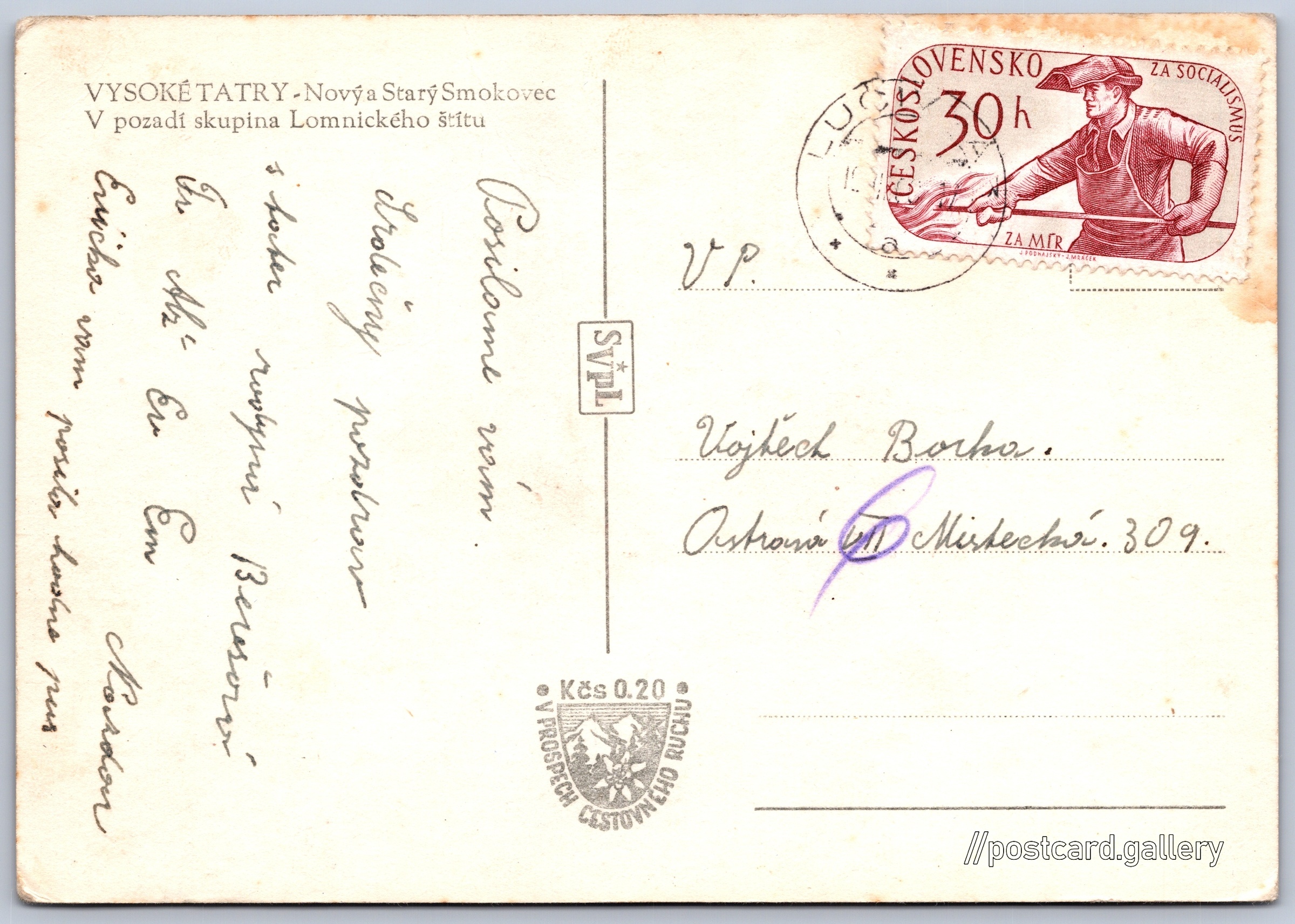 Nový a Starý Smokovec Pokud chcete vidět pohlednice ve vyšším rozlišení nebo zobrazovat jejich zadní stranu, tak se prosím nejdříve přihlašte Přihlásit Zaregistrovat VYSOKÉ TATRY - Nový a Starý SmokovecV pozadí skupina Lomnického štítu Jazyk tištěného textu na pohlednici: slovenština Starý Smokovec ukázat na mapě Vydavatel: VPL (Československo) Odhadované datum vydání pohlednice: 1955 - 1960 Pomozte nám zpřesnit rok vzniku pohlednice Velikost (š x v) a tvar pohlednice: 145 x 101 mm (5.71" x 3.98"), obdélník Prošlá poštou Ceny: Příplatek na tur. ruch: 0,20 Kčs (CSK))Vyplacené známky: 0,30 Kčs (CSK) DiskuseVložit příspěvek Přidat novou složku ... Spravovat složky ...