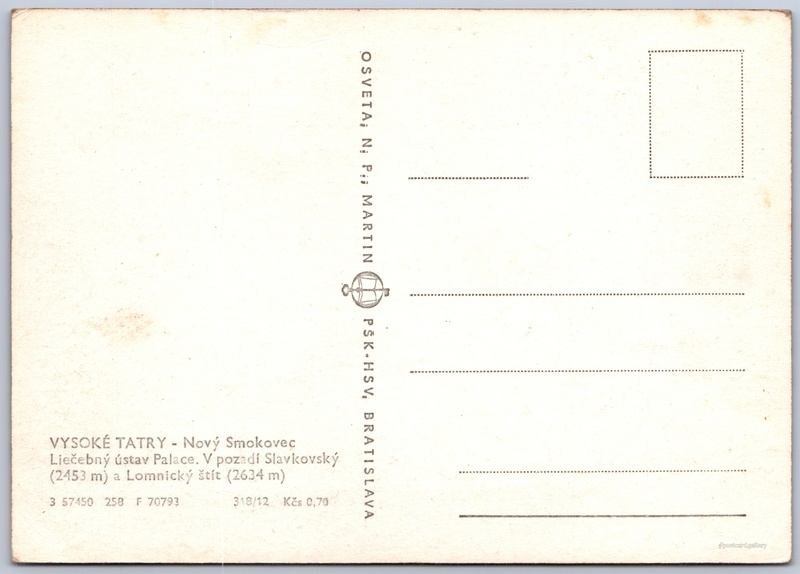 Nový Smokovec, léčebný ústav Palace Pokud chcete vidět pohlednice ve vyšším rozlišení nebo zobrazovat jejich zadní stranu, tak se prosím nejdříve přihlašte Přihlásit Zaregistrovat VYSOKÉ TATRY - Nový SmokovecLiečebný ústav Palace. V pozadí Slavkovský (2453 m) a Lomnický štít (2634 m) Jazyk tištěného textu na pohlednici: slovenština Starý Smokovec 32 ukázat na mapě V blízkém okolí místa zobrazeného na pohlednici lze najít 62 jiných pohlednic. Zobrazit blízké pohlednice Vydavatel: Osveta, n. p., Martin PŠK - Bratislava (Československo) Rok vydání pohlednice: únor, 1958 Velikost (š x v) a tvar pohlednice: 146 x 104 mm (5.75" x 4.09"), obdélník Čistá pohlednice (neprošlá poštou) Ceny: Cena pohlednice: 0,70 Kčs (CSK) Kódy na pohlednici: 3 57450 258 F 70793 318/12 DiskuseVložit příspěvek Přidat novou složku ... Spravovat složky ...
