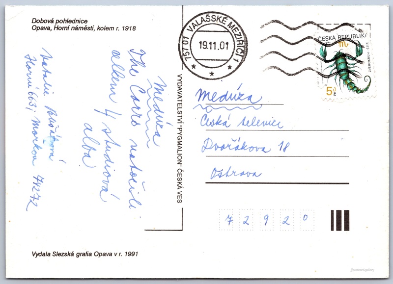 Opava, městské divadlo, dobová pohlednice Pokud chcete vidět pohlednice ve vyšším rozlišení nebo zobrazovat jejich zadní stranu, tak se prosím nejdříve přihlašte Přihlásit Zaregistrovat Troppau. Oberring mit Stadttheater. Dobová pohledniceOpava, Horní náměstí, kolem r. 1918Vydala Slezská grafia Opava v r. 1991 Jazyk tištěného textu na pohlednici: čeština Horní náměstí, Opava, Opava ukázat na mapě V blízkém okolí místa zobrazeného na pohlednici lze najít 4 jiné pohlednice. Zobrazit blízké pohlednice Vydavatel: Pygmalion, Česká Ves (Československo) Odhadované datum vydání pohlednice: 1998 - 2001 Pomozte nám zpřesnit rok vzniku pohlednice Velikost (š x v) a tvar pohlednice: 147 x 105 mm (5.79" x 4.13"), obdélník Prošlá poštou:Datum na razítku: 19.11.2001 Ceny: Vyplacené známky: 5,40 Kč (CZK) DiskuseVložit příspěvek Přidat novou složku ... Spravovat složky ...