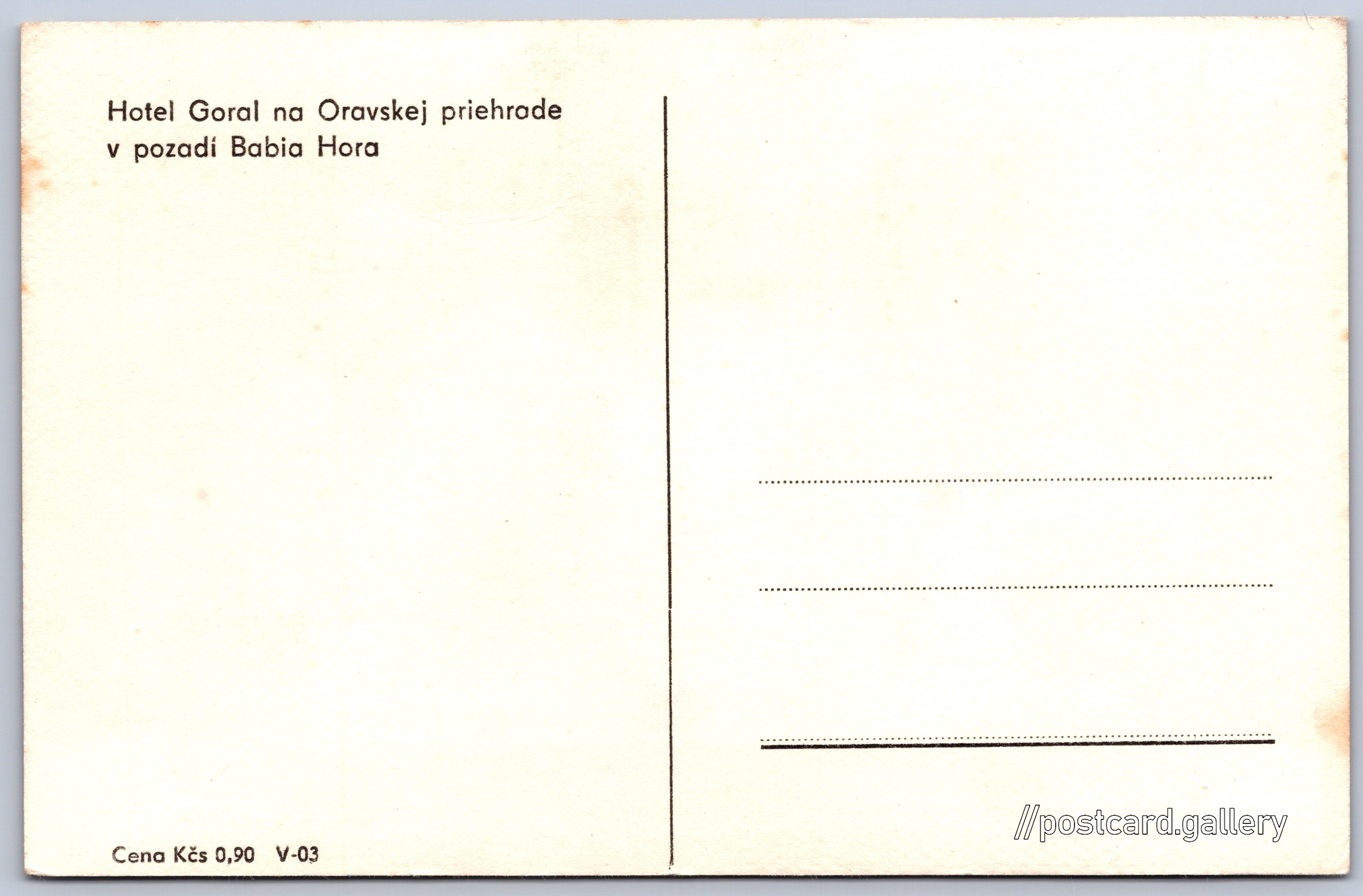 Oravská přehrada, hotel Goral Pokud chcete vidět pohlednice ve vyšším rozlišení nebo zobrazovat jejich zadní stranu, tak se prosím nejdříve přihlašte Přihlásit Zaregistrovat Hotel Goral na Oravskej priehradev pozadí Babia Hora Jazyk tištěného textu na pohlednici: slovenština Goral, Budova, Ústie nad Priehradou 308, Trstená - Ústie nad Priehradou, Slovensko ukázat na mapě V blízkém okolí místa zobrazeného na pohlednici lze najít 11 jiných pohlednic. Zobrazit blízké pohlednice Datum vydání není známo Pomozte nám odhadnout datum vzniku pohlednice Velikost (š x v) a tvar pohlednice: 139 x 90 mm (5.47" x 3.54"), obdélník Čistá pohlednice (neprošlá poštou) Ceny: Cena pohlednice: 0,90 Kčs (CSK) Kódy na pohlednici: V-03 DiskuseVložit příspěvek Přidat novou složku ... Spravovat složky ...