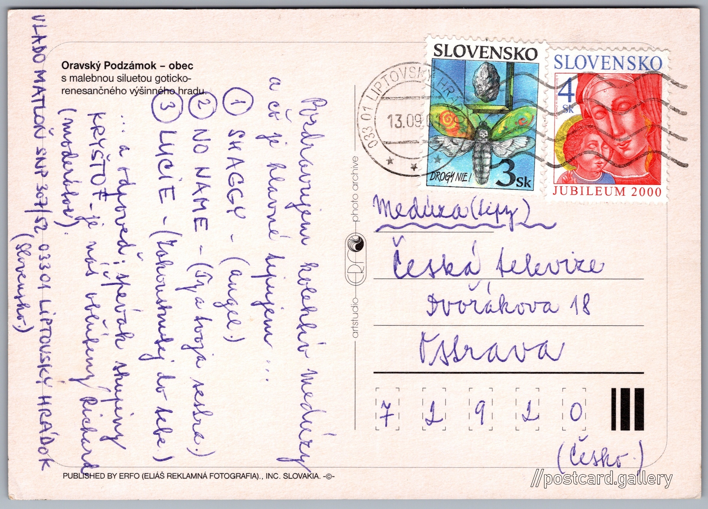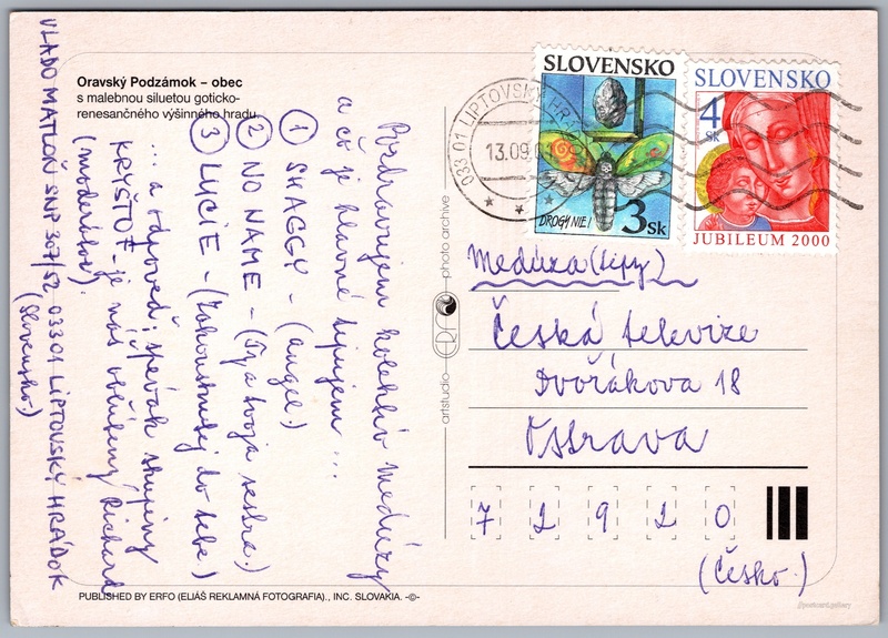 Oravský zámok Pokud chcete vidět pohlednice ve vyšším rozlišení nebo zobrazovat jejich zadní stranu, tak se prosím nejdříve přihlašte Přihlásit Zaregistrovat Oravský zámok Oravský Podzámok - obec s malebnou siluetou goticko-renesančného výšinného hradu. Jazyk tištěného textu na pohlednici: slovenština Oravský hrad, Hrad, Oravský Podzámok 1, Oravský Podzámok, Slovensko ukázat na mapě V blízkém okolí místa zobrazeného na pohlednici lze najít 11 jiných pohlednic. Zobrazit blízké pohlednice Vydavatel: Artstudio Erfo (Slovensko) Odhadované datum vydání pohlednice: 1998 - 2001 Pomozte nám zpřesnit rok vzniku pohlednice Velikost (š x v) a tvar pohlednice: 149 x 105 mm (5.87" x 4.13"), obdélník Prošlá poštou:Datum na razítku: 13.9.2001 Ceny: Vyplacené známky: 7,00 Sk (SKK) DiskuseVložit příspěvek Přidat novou složku ... Spravovat složky ...