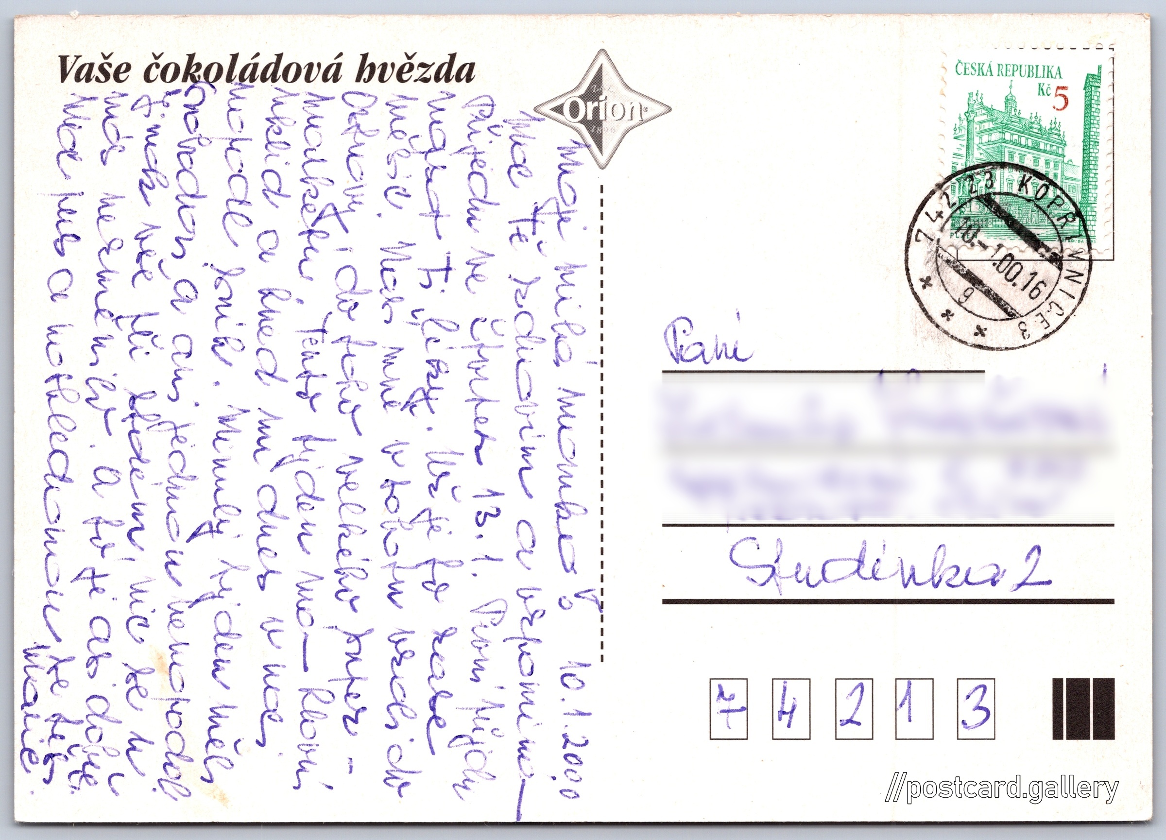 Orion, vaše čokoládová hvězda Pokud chcete vidět pohlednice ve vyšším rozlišení nebo zobrazovat jejich zadní stranu, tak se prosím nejdříve přihlašte Přihlásit Zaregistrovat OrionVaše čokoládová hvězda Vaše čokoládová hvězda Jazyk tištěného textu na pohlednici: čeština Vydavatel: Orion (Česko) Odhadované datum vydání pohlednice: 1997 - 2000 Pomozte nám zpřesnit rok vzniku pohlednice Velikost (š x v) a tvar pohlednice: 148 x 105 mm (5.83" x 4.13"), obdélník Prošlá poštou:Datum na razítku: 10.1.2000Datum napsání pohledu: 10.1.2000 Ceny: Vyplacené známky: 5,00 Kč (CZK) DiskuseVložit příspěvek Přidat novou složku ... Spravovat složky ...