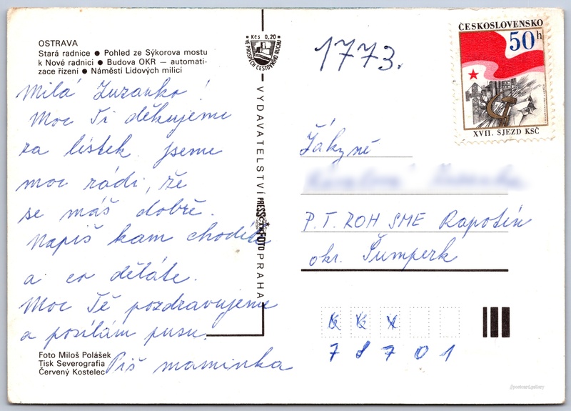 Ostrava Pokud chcete vidět pohlednice ve vyšším rozlišení nebo zobrazovat jejich zadní stranu, tak se prosím nejdříve přihlašte Přihlásit Zaregistrovat Ostrava OSTRAVA- Stará radnice- Pohled ze Sýkorova mostu k Nové radnici- Budova OKR automatizace řízení- Náměstí Lidových milicí Jazyk tištěného textu na pohlednici: čeština Masarykovo náměstí 1498/4, Ostrava, 702 00, Ostrava-město ukázat na mapě Vydavatel: PressFoto Praha (Československo) Datum vydání není známo Pomozte nám odhadnout datum vzniku pohlednice Velikost (š x v) a tvar pohlednice: 148 x 105 mm (5.83" x 4.13"), obdélník Osoby spjaté s touto pohlednicí: Miloš Polášek(Autor fotografie) Prošlá poštou Ceny: Příplatek na tur. ruch: 0,20 Kčs (CSK))Vyplacené známky: 0,50 Kčs (CSK) DiskuseVložit příspěvek Přidat novou složku ... Spravovat složky ...