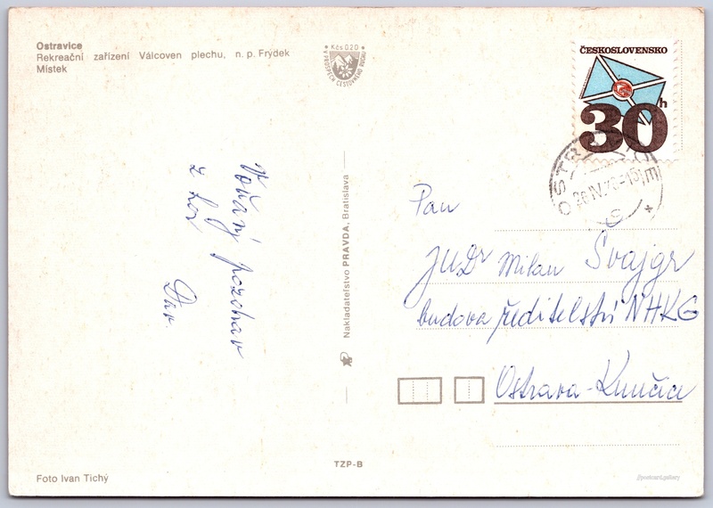 Ostravice, rekreační středisko Válcoven plechu FM Pokud chcete vidět pohlednice ve vyšším rozlišení nebo zobrazovat jejich zadní stranu, tak se prosím nejdříve přihlašte Přihlásit Zaregistrovat OstraviceRekreační zařízení Válcoven plechu, n. p. Frýdek Místek Jazyk tištěného textu na pohlednici: čeština Ostravice ev. č. 1279, Ostravice, 739 14, Frýdek-Místek ukázat na mapě V blízkém okolí místa zobrazeného na pohlednici lze najít 12 jiných pohlednic. Zobrazit blízké pohlednice Vydavatel: Nakladateľstvo PRAVDA, Bratislava (Československo) Odhadované datum vydání pohlednice: 1975 - 1978 Pomozte nám zpřesnit rok vzniku pohlednice Velikost (š x v) a tvar pohlednice: 148 x 104 mm (5.83" x 4.09"), obdélník Osoby spjaté s touto pohlednicí: Ivan Tichý(Autor fotografie) Prošlá poštou:Datum na razítku: 26.4.1978 Ceny: Příplatek na tur. ruch: 0,20 Kčs (CSK))Vyplacené známky: 0,30 Kčs (CSK) DiskuseVložit příspěvek Přidat novou složku ... Spravovat složky ...