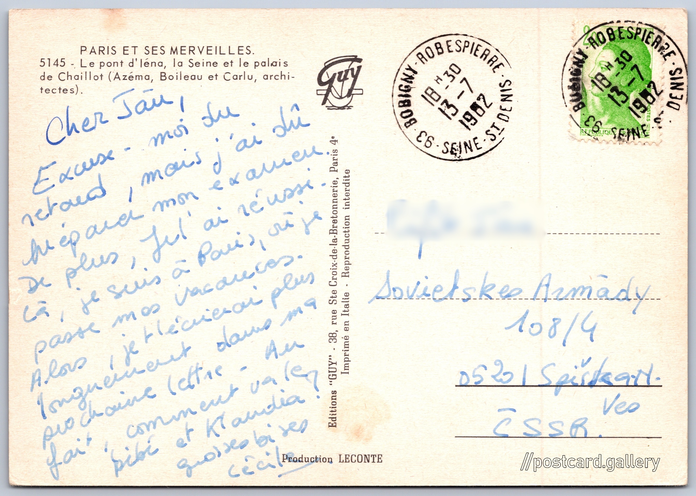 Paříž, most d'Iéna Pokud chcete vidět pohlednice ve vyšším rozlišení nebo zobrazovat jejich zadní stranu, tak se prosím nejdříve přihlašte Přihlásit Zaregistrovat PARIS ET SES MERVEILLES.5145 - Le pont d'Iéna, la Seine et le palais de Chaillot (Azéma, Boileau et Carlu, architectes). Jazyk tištěného textu na pohlednici: francouzština Pont d'Iéna, Most, Paříž - 7. obvod, Francie ukázat na mapě Vydavatel: Editions GUY (Francie) Odhadované datum vydání pohlednice: 1979 - 1982 Pomozte nám zpřesnit rok vzniku pohlednice Velikost (š x v) a tvar pohlednice: 148 x 103 mm (5.83" x 4.06"), obdélník Prošlá poštou:Datum na razítku: 13.7.1982 Ceny: Vyplacené známky: 2,00 F (FRF) DiskuseVložit příspěvek Přidat novou složku ... Spravovat složky ...