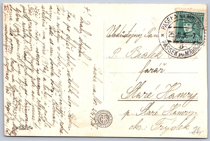 Paseka na Moravě, plicní léčebna Pokud chcete vidět pohlednice ve vyšším rozlišení nebo zobrazovat jejich zadní stranu, tak se prosím nejdříve přihlašte Přihlásit Zaregistrovat Pohledy s letadla č. 415Zemská léčebna plicní v Pasece na Moravě.Nákl. Klubu če, turistů v Prazes povol. MNO. č. 645.373 let. 1923 Jazyk tištěného textu na pohlednici: čeština Paseka, Olomouc ukázat na mapě V blízkém okolí místa zobrazeného na pohlednici lze najít 1 jinou pohlednici. Zobrazit blízké pohlednice Vydavatel: Klub československých turistů (Československo) Odhadované datum vydání pohlednice: 1933 - 1936 Pomozte nám zpřesnit rok vzniku pohlednice Velikost (š x v) a tvar pohlednice: 137 x 91 mm (5.39" x 3.58"), obdélník Prošlá poštou:Datum na razítku: 25.7.1936Datum napsání pohledu: 24.7.1936 Ceny: Vyplacené známky: 0,50 Kčs (CSK) DiskuseVložit příspěvek Přidat novou složku ... Spravovat složky ...