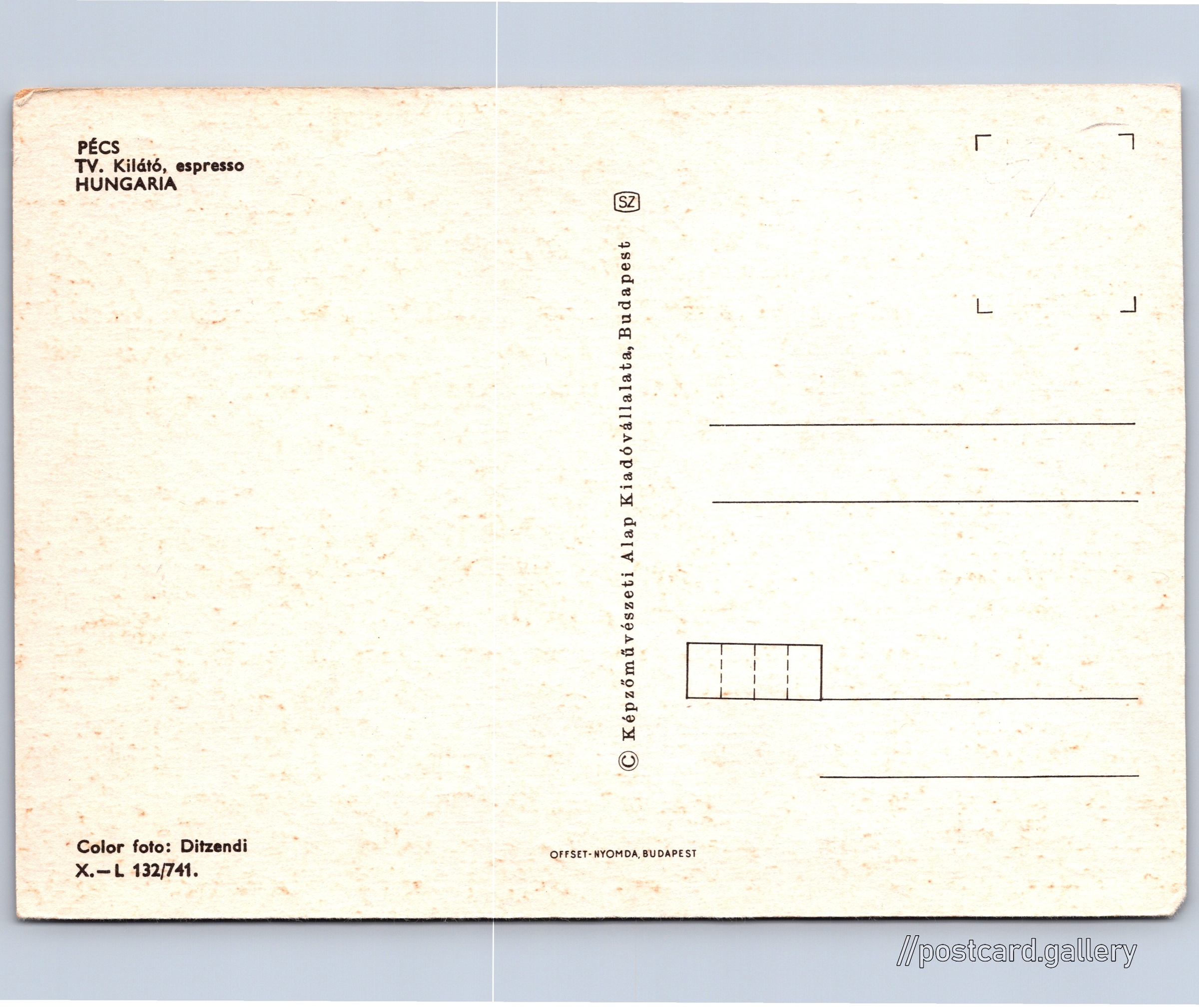 Pécs, televizní vysílač Pokud chcete vidět pohlednice ve vyšším rozlišení nebo zobrazovat jejich zadní stranu, tak se prosím nejdříve přihlašte Přihlásit Zaregistrovat PÉCSTV. Kilátó, espressoHUNGARIA Jazyk tištěného textu na pohlednici: maďarština János-kilátó, Rozhledna, Dunántúl, Maďarsko ukázat na mapě Vydavatel: Képzőművészeti Alap Kiadóvállalata (Maďarsko) Datum vydání není známo Pomozte nám odhadnout datum vzniku pohlednice Velikost (š x v) a tvar pohlednice: 148 x 105 mm (5.83" x 4.13"), obdélník Osoby spjaté s touto pohlednicí: Ditzendi(Autor fotografie) Čistá pohlednice (neprošlá poštou) Kódy na pohlednici: X.-L 132/741 DiskuseVložit příspěvek Přidat novou složku ... Spravovat složky ...