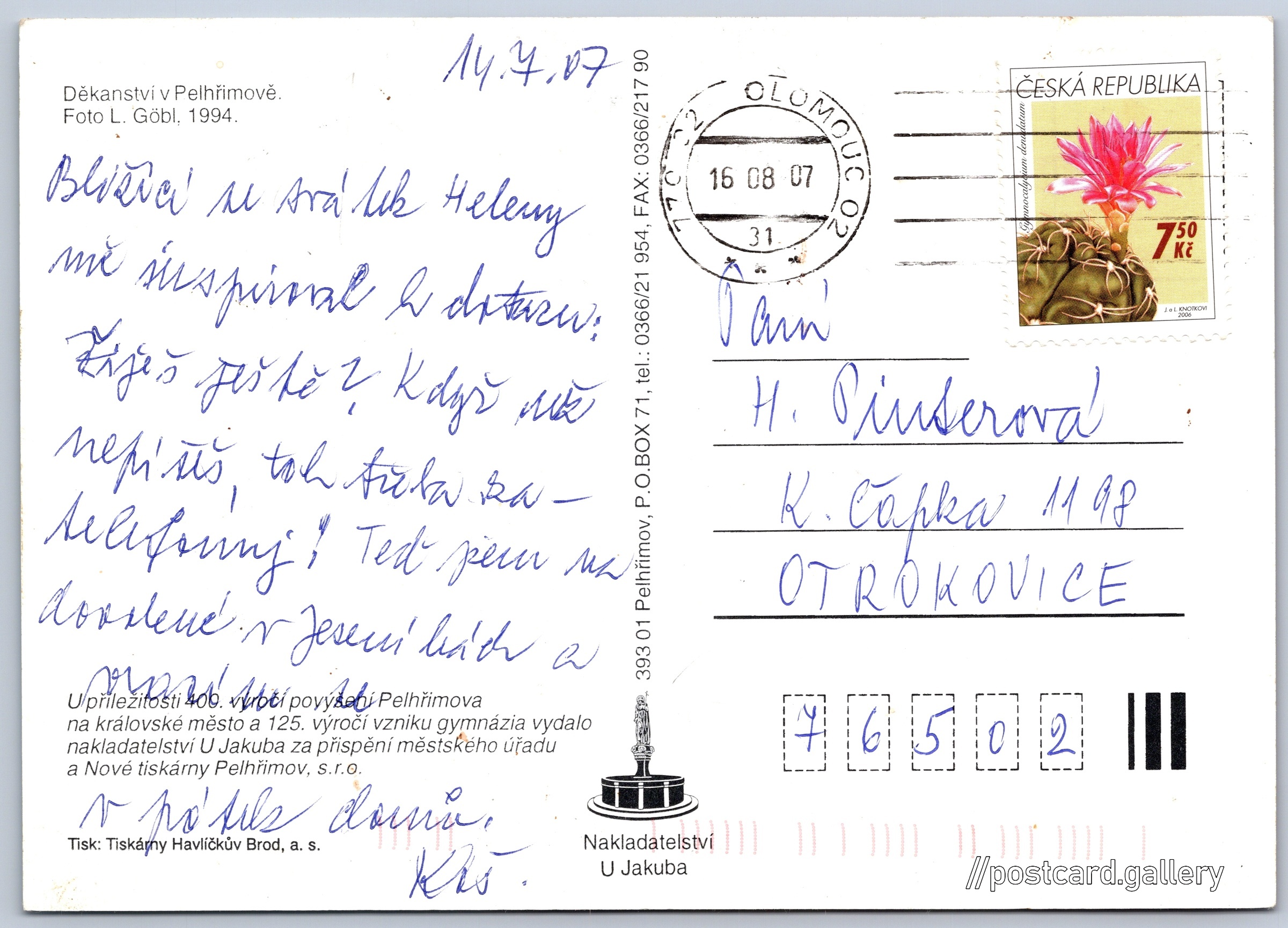 Pelhřimov, děkanství Pokud chcete vidět pohlednice ve vyšším rozlišení nebo zobrazovat jejich zadní stranu, tak se prosím nejdříve přihlašte Přihlásit Zaregistrovat Děkanství v Pelhřimově.U příležitosti 400. výročí povýšení Pelhřimova na královské město a 125. výročí vzniku gymnázia vydalo nakladatelství U Jakuba za přispění městského úřadu a Nové tiskárny Pelhřimov, s.r.o. Jazyk tištěného textu na pohlednici: čeština Děkanská 8, Pelhřimov, 393 01, Pelhřimov ukázat na mapě Rok vydání pohlednice: 1996 Velikost (š x v) a tvar pohlednice: 147 x 105 mm (5.79" x 4.13"), obdélník Osoby spjaté s touto pohlednicí: L. Göbl(Autor fotografie) Prošlá poštou:Datum na razítku: 16.8.2007Datum napsání pohledu: 14.7.2007 Ceny: Vyplacené známky: 7,50 Kč (CZK) DiskuseVložit příspěvek Přidat novou složku ... Spravovat složky ...