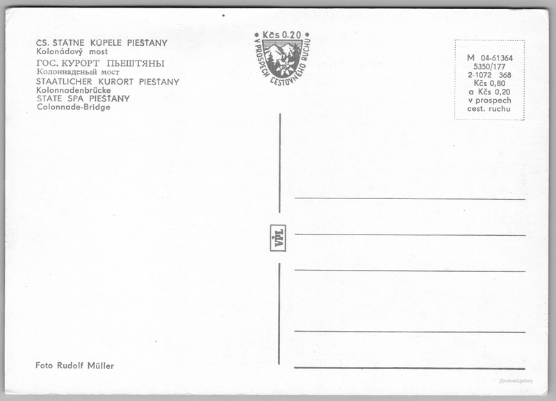 Piešťany, kolonádní most Pokud chcete vidět pohlednice ve vyšším rozlišení nebo zobrazovat jejich zadní stranu, tak se prosím nejdříve přihlašte Přihlásit Zaregistrovat ČS. ŠTÁTNE KÚPELE PIEŠŤANYKolonádový mostГОС. КУРОРТ ПЬЕШТЯНЫКолоннаденый мостSTAATLICHER KURORT PIEŠŤANYKolonnadenbrückeSTATE SPA PIEŠŤANYColonnade-Bridge Jazyk tištěného textu na pohlednici: slovenština Kolonádní most, Most, Sad Andreja Kmeťa 1783/72, Piešťany, Slovensko ukázat na mapě V blízkém okolí místa zobrazeného na pohlednici lze najít 22 jiných pohlednic. Zobrazit blízké pohlednice Vydavatel: VPL (Československo) Datum vydání není známo Pomozte nám odhadnout datum vzniku pohlednice Velikost (š x v) a tvar pohlednice: 148 x 106 mm (5.83" x 4.17"), obdélník Osoby spjaté s touto pohlednicí: Rudolf Müller(Autor fotografie) Čistá pohlednice (neprošlá poštou) Ceny: Cena pohlednice: 0,80 Kčs (CSK) (+0,20 Kčs přípl. na tur. ruch) Kódy na pohlednici: M 04-61364 5350/177 2-1072 368 DiskuseVložit příspěvek Přidat novou složku ... Spravovat složky ...