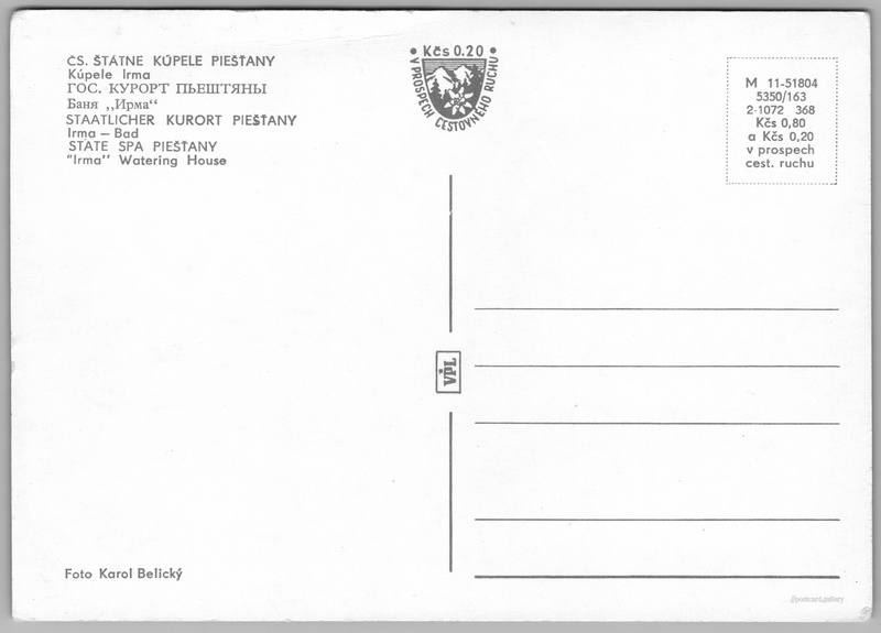 Piešťany Pokud chcete vidět pohlednice ve vyšším rozlišení nebo zobrazovat jejich zadní stranu, tak se prosím nejdříve přihlašte Přihlásit Zaregistrovat ČS. ŠTÁTNE KÚPELE PIEŠŤANYKúpele IrmaГОС. КУРОРТ ПЬЕШТЯНЫБаня ,,Ирма"STAATLICHER KURORT PIEŠŤANYIrma - BadSTATE SPA PIEŠŤANY"Irma" Watering House Jazyk tištěného textu na pohlednici: slovenština Irma, Budova, Nábrežie Justusa Jána Torkosa 3591/4, Piešťany, Slovensko ukázat na mapě V blízkém okolí místa zobrazeného na pohlednici lze najít 22 jiných pohlednic. Zobrazit blízké pohlednice Vydavatel: VPL (Československo) Datum vydání není známo Pomozte nám odhadnout datum vzniku pohlednice Velikost (š x v) a tvar pohlednice: 149 x 106 mm (5.87" x 4.17"), obdélník Osoby spjaté s touto pohlednicí: Karol Belický(Autor fotografie) Čistá pohlednice (neprošlá poštou) Ceny: Cena pohlednice: 0,80 Kčs (CSK) (+0,20 Kčs přípl. na tur. ruch) Kódy na pohlednici: M 11-51804 5350/163 2-1072 368 DiskuseVložit příspěvek Přidat novou složku ... Spravovat složky ...