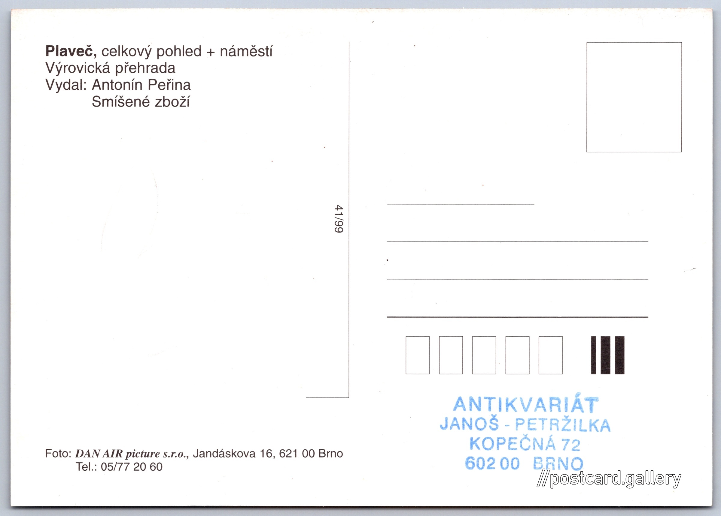 Plaveč, celkový pohled Pokud chcete vidět pohlednice ve vyšším rozlišení nebo zobrazovat jejich zadní stranu, tak se prosím nejdříve přihlašte Přihlásit Zaregistrovat Plaveč Plaveč, celkový pohled + náměstíVýrovická přehradaVydal: Antonín PeřinaSmíšené zboží Jazyk tištěného textu na pohlednici: čeština Plaveč, Obec, Česko ukázat na mapě Vydavatel: DAN AIR picture (Česko) Rok vydání pohlednice: 1999 Velikost (š x v) a tvar pohlednice: 148 x 105 mm (5.83" x 4.13"), obdélník Čistá pohlednice (neprošlá poštou) Kódy na pohlednici: 41/99 DiskuseVložit příspěvek Přidat novou složku ... Spravovat složky ...