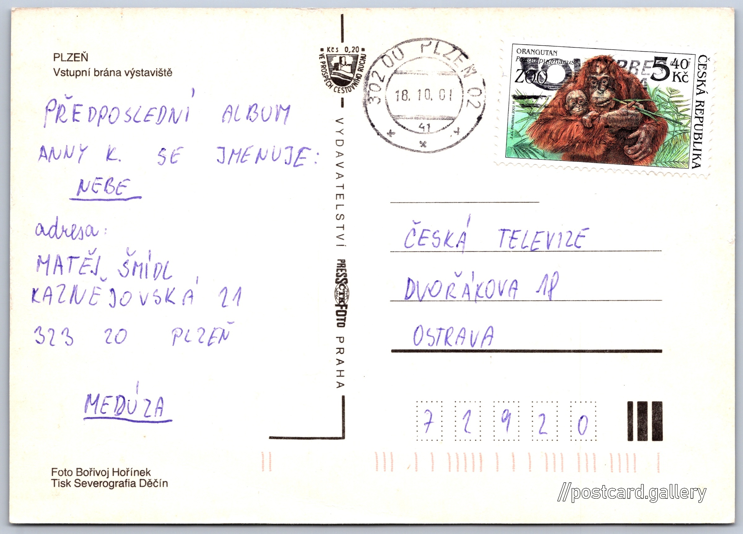 Plzeň, vstupní brána výstaviště Pokud chcete vidět pohlednice ve vyšším rozlišení nebo zobrazovat jejich zadní stranu, tak se prosím nejdříve přihlašte Přihlásit Zaregistrovat PLZEŇVstupní brána výstaviště Jazyk tištěného textu na pohlednici: čeština Bývalé Plzeňské výstaviště, Zaniklý objekt či ves, Plzeň - Severní Předměstí, Česko ukázat na mapě Přesné místo není známo. Pokud jej znáte, tak jej prosím napište do komentářů nebo označte na mapě Vydavatel: PressFoto Praha (Československo) Odhadované datum vydání pohlednice: 1990 - 1993 Pomozte nám zpřesnit rok vzniku pohlednice Velikost (š x v) a tvar pohlednice: 148 x 105 mm (5.83" x 4.13"), obdélník Osoby spjaté s touto pohlednicí: Bořivoj Hořínek(Autor fotografie) Prošlá poštou:Datum na razítku: 18.10.2001 Ceny: Příplatek na tur. ruch: 0,20 Kčs (CSK))Vyplacené známky: 5,40 Kč (CZK) DiskuseVložit příspěvek Přidat novou složku ... Spravovat složky ...
