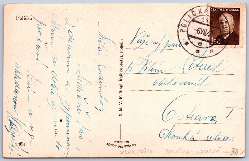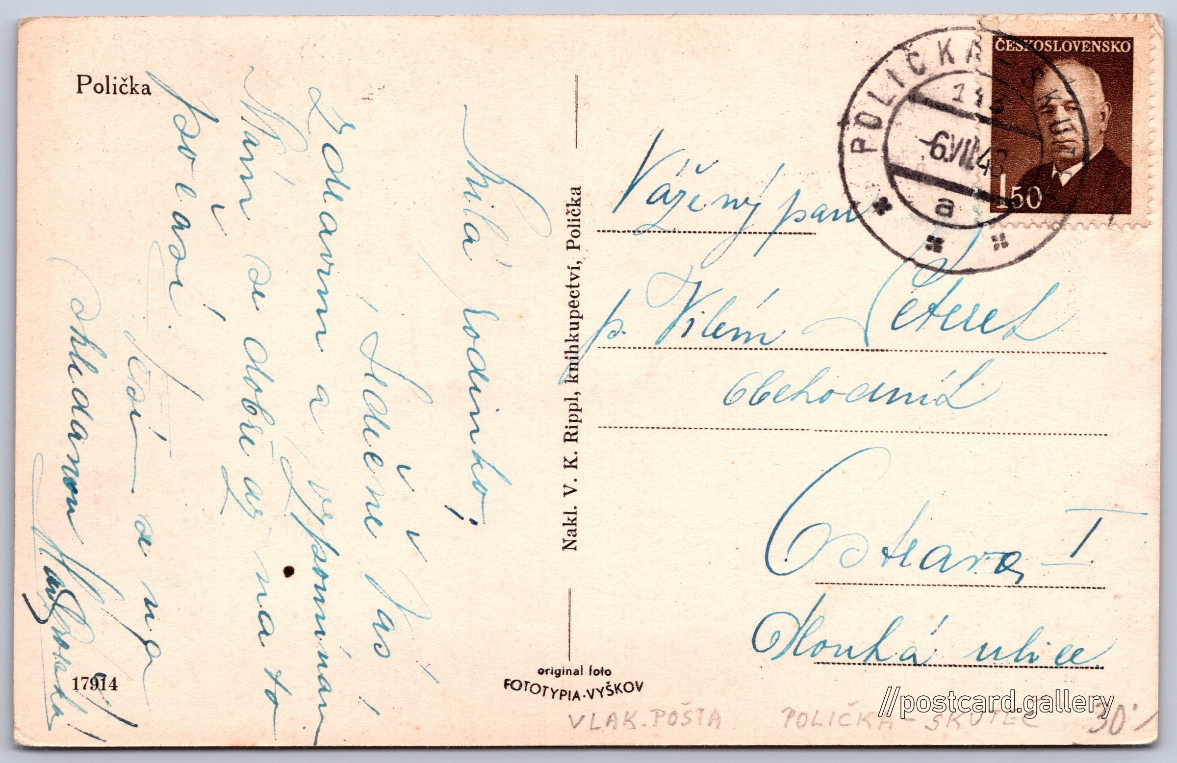 Polička, pohled na město Pokud chcete vidět pohlednice ve vyšším rozlišení nebo zobrazovat jejich zadní stranu, tak se prosím nejdříve přihlašte Přihlásit Zaregistrovat Polička Jazyk tištěného textu na pohlednici: čeština Kostelní 83, Polička, 572 01, Svitavy ukázat na mapě Vydavatel: Fototypia - Vyškov (Československo)V. K. Rippl, knihkupectví (Československo) Odhadované datum vydání pohlednice: 1945 - 1948 Pomozte nám zpřesnit rok vzniku pohlednice Velikost (š x v) a tvar pohlednice: 140 x 89 mm (5.51" x 3.50"), obdélník Prošlá poštou:Datum na razítku: 6.7.1948 Ceny: Vyplacené známky: 1,50 Kčs (CSK) Kódy na pohlednici: 71914 DiskuseVložit příspěvek Přidat novou složku ... Spravovat složky ...