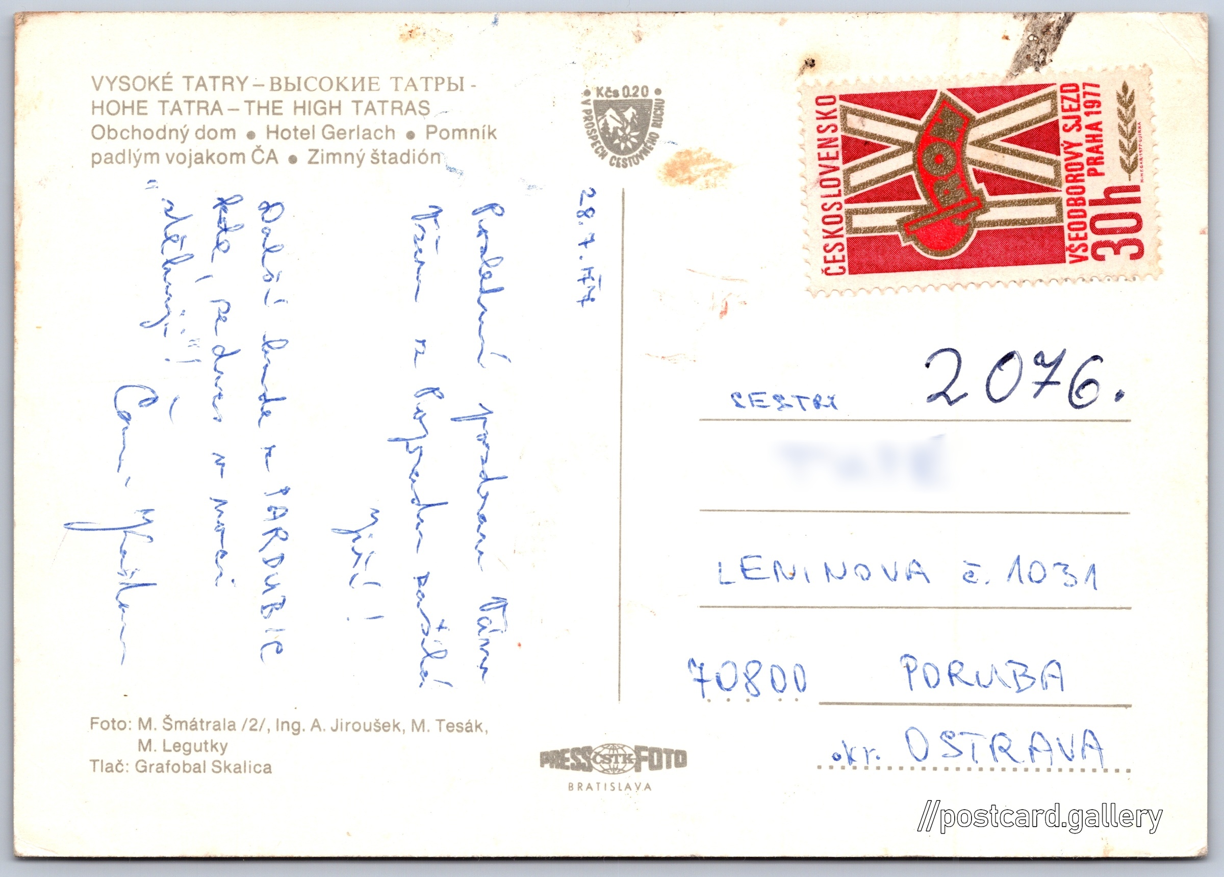 Poprad Pokud chcete vidět pohlednice ve vyšším rozlišení nebo zobrazovat jejich zadní stranu, tak se prosím nejdříve přihlašte Přihlásit Zaregistrovat Poprad VYSOKÉ TATRY - ВЫСОКИЕ ТАТРЫ - HOHE TATRA - THE HIGH TATRAS- Obchodný dom- Hotel Gerlach- Pomník padlým vojakom ČA- Zimný štadión Jazyky tištěného textu na pohlednici: čeština, ruština, němčina, angličtina Poprad ukázat na mapě Vydavatel: PressFoto Bratislava (Československo) Odhadované datum vydání pohlednice: 1974 - 1977 Pomozte nám zpřesnit rok vzniku pohlednice Velikost (š x v) a tvar pohlednice: 148 x 105 mm (5.83" x 4.13"), obdélník Osoby spjaté s touto pohlednicí: Alexander Jiroušek(Autor fotografie) Milan Šmátrala(Autor fotografie) Milan Tesák(Autor fotografie) M. Legutky(Autor fotografie) Prošlá poštou:Datum napsání pohledu: 28.7.1977 Ceny: Příplatek na tur. ruch: 0,20 Kčs (CSK))Vyplacené známky: 0,30 Kčs (CSK) DiskuseVložit příspěvek Přidat novou složku ... Spravovat složky ...
