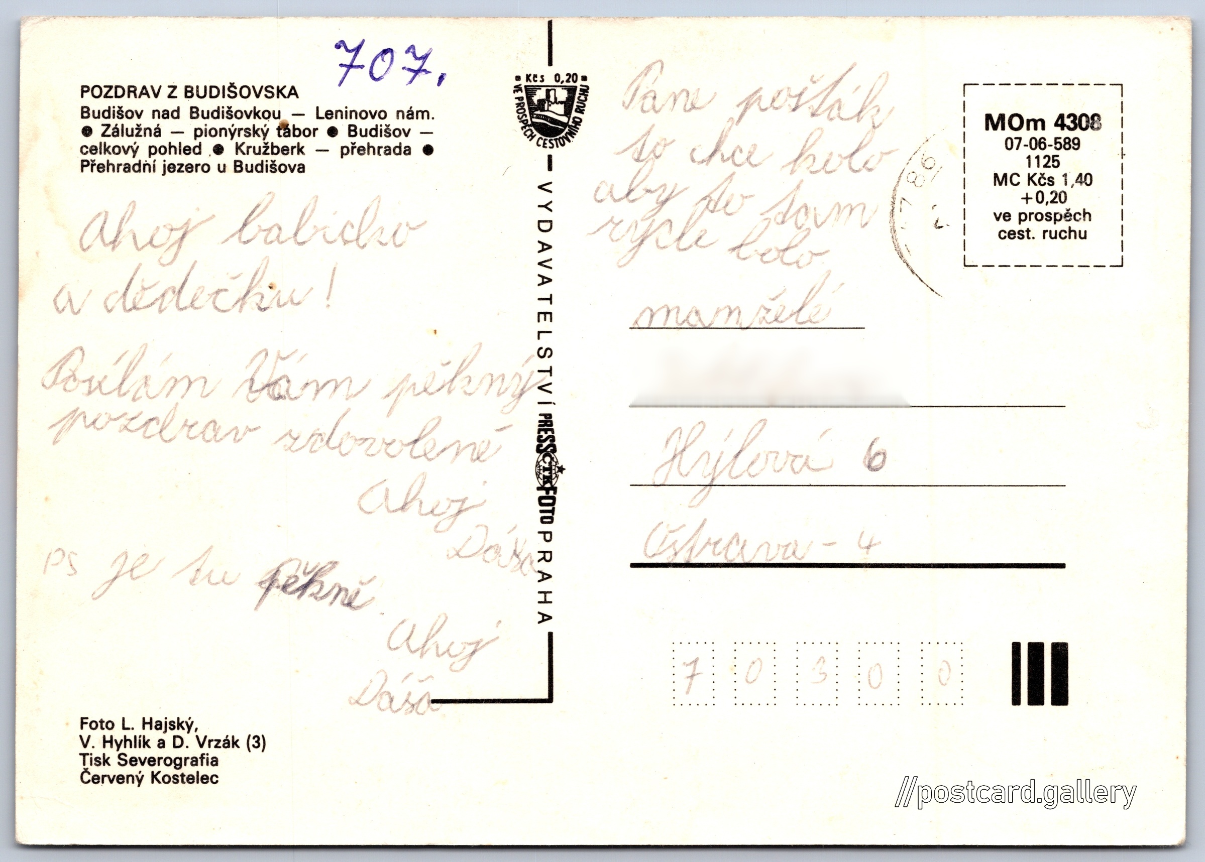 Pozdrav z Budišovska Pokud chcete vidět pohlednice ve vyšším rozlišení nebo zobrazovat jejich zadní stranu, tak se prosím nejdříve přihlašte Přihlásit Zaregistrovat Pozdrav z Budišovska POZDRAV Z BUDIŠOVSKA- Budišov nad Budišovkou - Leninovo nám.- Zálužná - pionýrský tábor- Budišov - celkový pohled- Kružberk - přehrada- Přehradní jezero u Budišova Jazyk tištěného textu na pohlednici: čeština náměstí Republiky, Budišov nad Budišovkou, Opava ukázat na mapě Vydavatel: PressFoto Praha (Československo) Rok vydání pohlednice: 1985 Velikost (š x v) a tvar pohlednice: 149 x 105 mm (5.87" x 4.13"), obdélník Osoby spjaté s touto pohlednicí: Daniel Vrzák(Autor fotografie) Vladimír Hyhlík(Autor fotografie) Libor Hajský(Autor fotografie) Prošlá poštou Ceny: Cena pohlednice: 1,40 Kčs (CSK) (+0,20 Kčs přípl. na tur. ruch) Kódy na pohlednici: MOm 4308 07-06-589 1125 DiskuseVložit příspěvek Přidat novou složku ... Spravovat složky ...