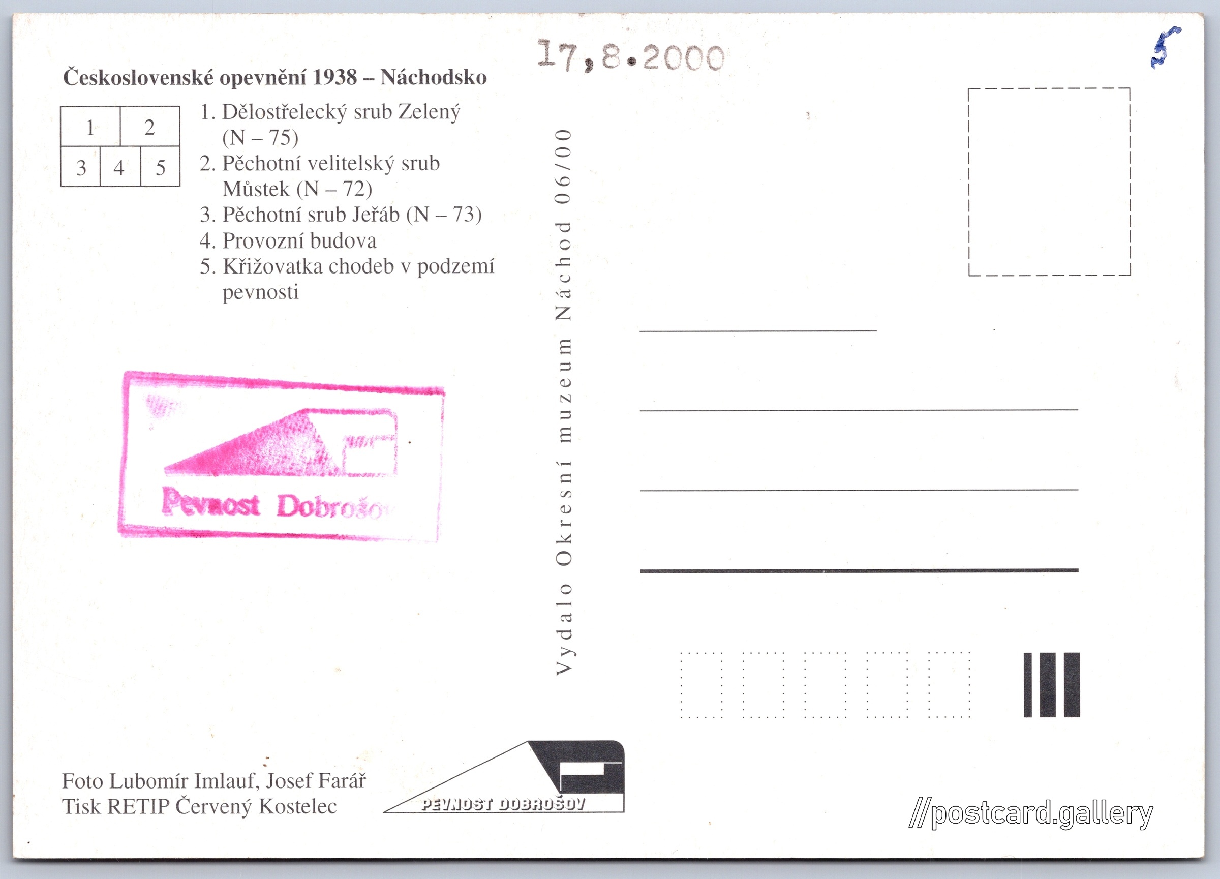 Pozdrav z Dobrošovské pevnosti Pokud chcete vidět pohlednice ve vyšším rozlišení nebo zobrazovat jejich zadní stranu, tak se prosím nejdříve přihlašte Přihlásit Zaregistrovat Pozdrav z Dobrošovské pevnosti Československé opevnění 1938 - Náchodsko1. Dělostřelecký srub Zelený (N-75)2. Pěchotní velitelský srub Můstek (N-72)3. Pěchotní srub Jeřáb (N – 73)4. Provozní budova5. Křižovatka chodeb v podzemí pevnosti Jazyk tištěného textu na pohlednici: čeština Dobrošov 97, Náchod, 547 01, Náchod ukázat na mapě Vydavatel: Okresní muzeum Náchod (Česko) Rok vydání pohlednice: 2000 Velikost (š x v) a tvar pohlednice: 148 x 105 mm (5.83" x 4.13"), obdélník Osoby spjaté s touto pohlednicí: Lubomír Imlauf(Autor fotografie) Josef Farář(Autor fotografie) Čistá pohlednice (neprošlá poštou) DiskuseVložit příspěvek Přidat novou složku ... Spravovat složky ...