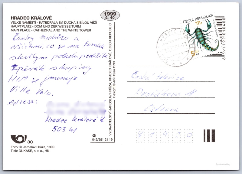Pozdrav z Hradce Králové Pokud chcete vidět pohlednice ve vyšším rozlišení nebo zobrazovat jejich zadní stranu, tak se prosím nejdříve přihlašte Přihlásit Zaregistrovat HRADEC KRÁLOVÉVELKÉ NÁMĚSTÍ - KATEDRÁLA SV. DUCHA S BÍLOU VĚŽÍHAUPTPLATZ - DOM UND DER WEISSE TURMMAIN PLACE - CATHEDRAL AND THE WHITE TOWER Jazyky tištěného textu na pohlednici: čeština, němčina, angličtina Rok vydání pohlednice: 1999 Velikost (š x v) a tvar pohlednice: 148 x 105 mm (5.83" x 4.13"), obdélník Osoby spjaté s touto pohlednicí: Jaroslav Hrůza(Autor fotografie) Prošlá poštou Ceny: Vyplacené známky: 5,40 Kč (CZK) Kódy na pohlednici: 1999 c. 40 DiskuseVložit příspěvek Přidat novou složku ... Spravovat složky ...