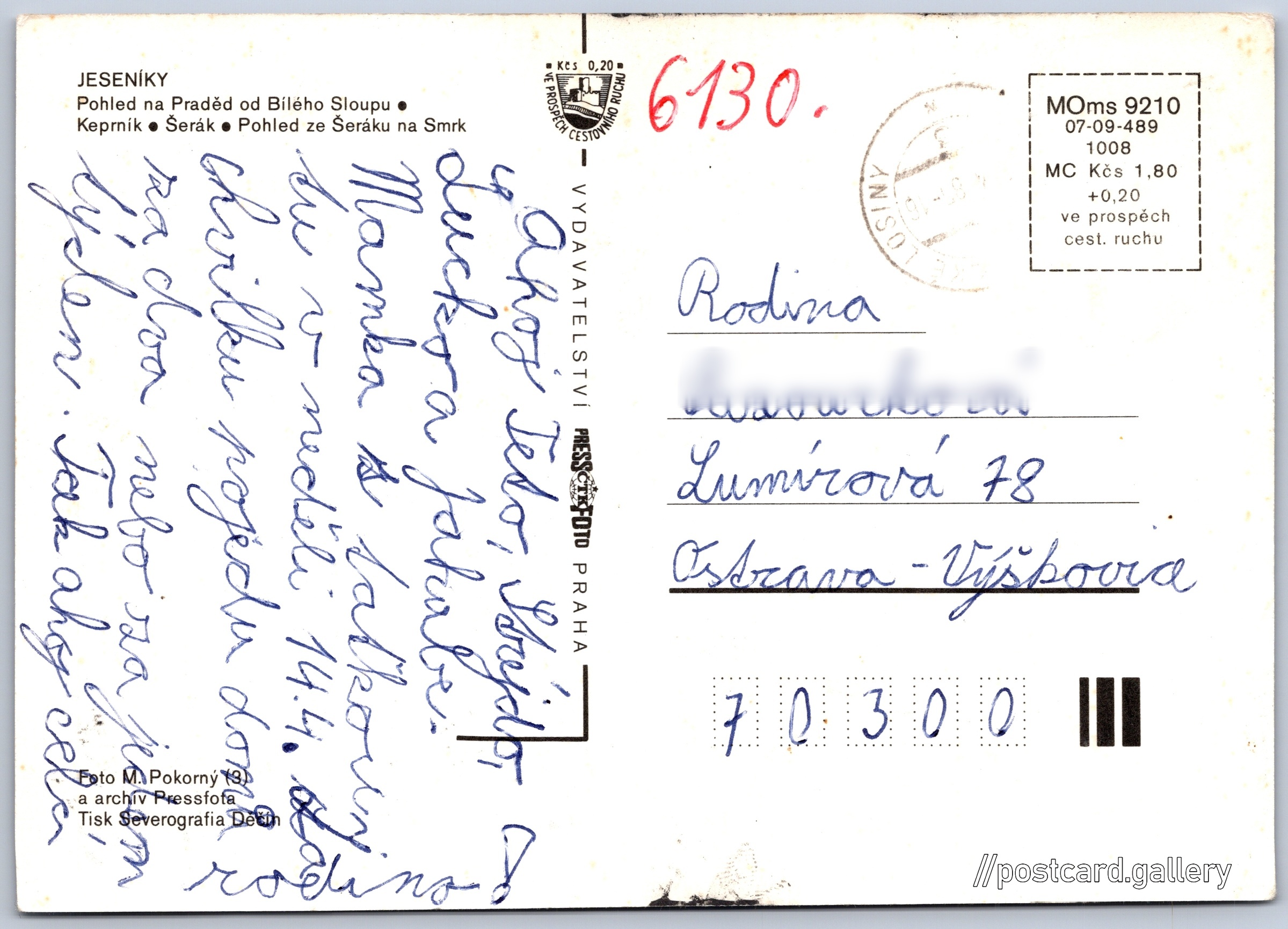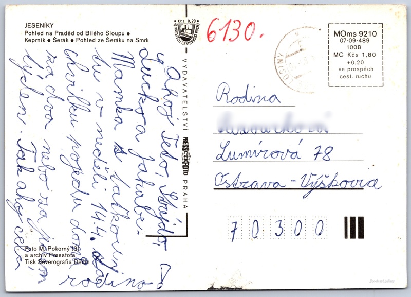 Pozdrav z Jeseníků Pokud chcete vidět pohlednice ve vyšším rozlišení nebo zobrazovat jejich zadní stranu, tak se prosím nejdříve přihlašte Přihlásit Zaregistrovat Pozdrav z Jeseníků JESENÍKY- Pohled na Praděd od Bílého Sloupu.- Keprník- Šerák- Pohled ze Šeráku na Smrk Jazyk tištěného textu na pohlednici: čeština Keprník (1423 m), Hora, výškový bod, Ostružná, Česko ukázat na mapě Vydavatel: PressFoto Praha (Československo) Rok vydání pohlednice: 1984 Velikost (š x v) a tvar pohlednice: 144 x 105 mm (5.67" x 4.13"), obdélník Osoby spjaté s touto pohlednicí: Miroslav Pokorný(Autor fotografie) Prošlá poštou Ceny: Cena pohlednice: 1,80 Kčs (CSK) (+0,20 Kčs přípl. na tur. ruch) Kódy na pohlednici: MOms 9210 07-09-489 1008 DiskuseVložit příspěvek Přidat novou složku ... Spravovat složky ...