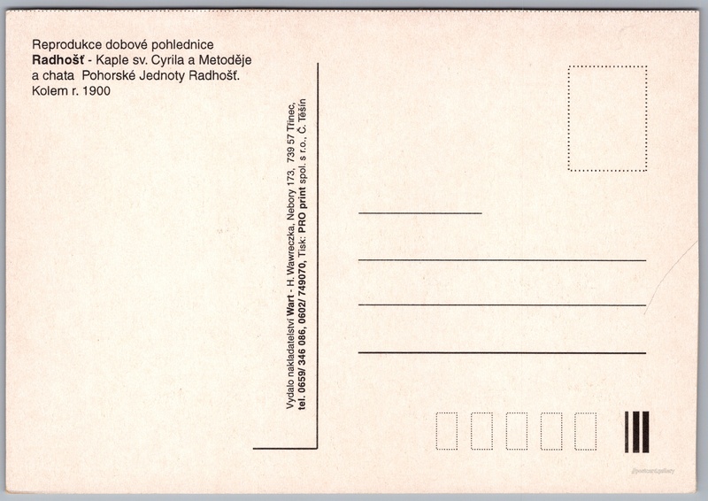 Pozdrav z Radhoště Pokud chcete vidět pohlednice ve vyšším rozlišení nebo zobrazovat jejich zadní stranu, tak se prosím nejdříve přihlašte Přihlásit Zaregistrovat Pozdrav z RadhoštěKaple s útulnouNákladem R Parmy ve Frenštátě r/R. Reprodukce dobové pohledniceRadhošť - Kaple sv. Cyrila a Metoděje a chata Pohorské Jednoty Radhošť. Jazyk tištěného textu na pohlednici: čeština Dolní Bečva 28, 756 55 Dolní Bečva, Czechia ukázat na mapě V blízkém okolí místa zobrazeného na pohlednici lze najít 31 jiných pohlednic. Zobrazit blízké pohlednice Vydavatel: Wart - H. Wareczka (Česko) Datum vydání není známo Pomozte nám odhadnout datum vzniku pohlednice Velikost (š x v) a tvar pohlednice: 151 x 106 mm (5.94" x 4.17"), obdélník Čistá pohlednice (neprošlá poštou) DiskuseVložit příspěvek Přidat novou složku ... Spravovat složky ...