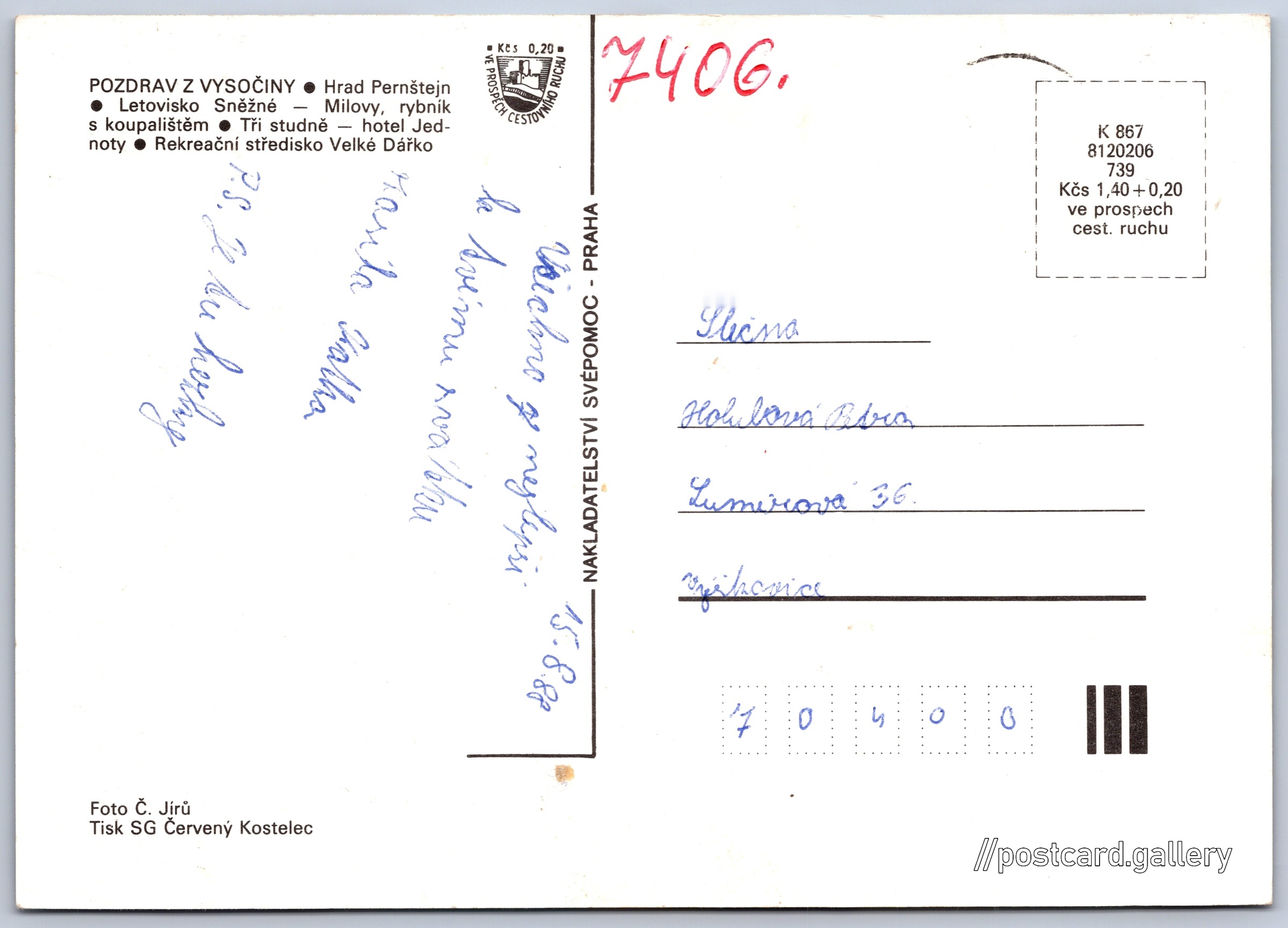 Pozdrav z Vysočiny Pokud chcete vidět pohlednice ve vyšším rozlišení nebo zobrazovat jejich zadní stranu, tak se prosím nejdříve přihlašte Přihlásit Zaregistrovat Pozdrav z Vysočiny POZDRAV Z VYSOČINY- Hrad Pernštejn- Letovisko Sněžné - Milovy, rybník s koupalištěm- Tři studně - hotel Jednoty- Rekreační středisko Velké Dářko Jazyk tištěného textu na pohlednici: čeština Hrad Pernštejn, Hrad, Pernštejn 13, Nedvědice - Pernštejn, Česko ukázat na mapě Vydavatel: Nakladatelství Svépomoc, Praha (Československo) Odhadované datum vydání pohlednice: 1985 - 1988 Pomozte nám zpřesnit rok vzniku pohlednice Velikost (š x v) a tvar pohlednice: 148 x 105 mm (5.83" x 4.13"), obdélník Osoby spjaté s touto pohlednicí: Čestmír Jírů(Autor fotografie) Prošlá poštou:Datum napsání pohledu: 15.8.1988 Ceny: Cena pohlednice: 1,40 Kčs (CSK) (+0,20 Kčs přípl. na tur. ruch) Kódy na pohlednici: K 867 8120206 739 DiskuseVložit příspěvek Přidat novou složku ... Spravovat složky ...