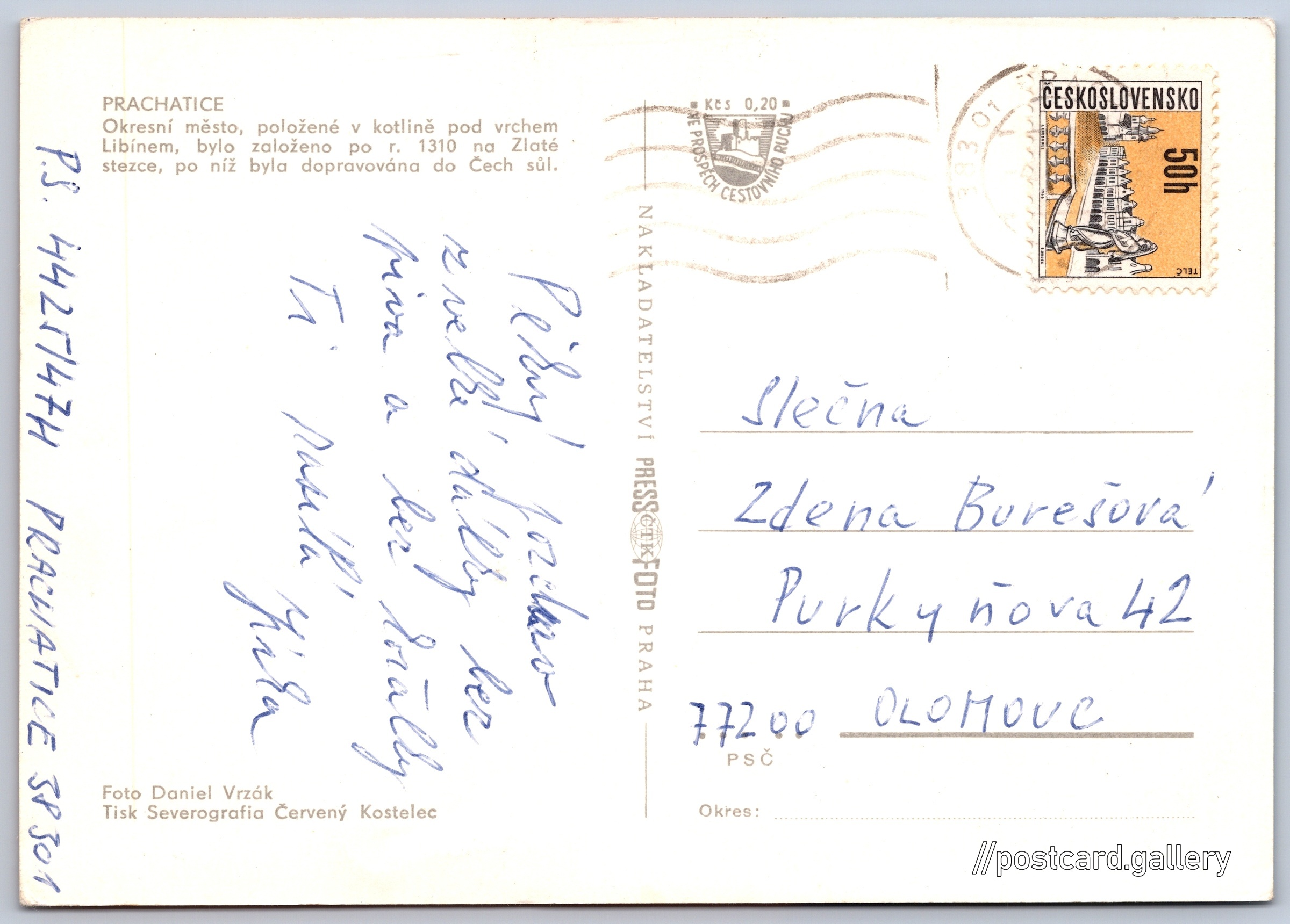 Prachatice, celkový pohled s mapou Pokud chcete vidět pohlednice ve vyšším rozlišení nebo zobrazovat jejich zadní stranu, tak se prosím nejdříve přihlašte Přihlásit Zaregistrovat Prachatice PRACHATICEOkresní město, položené v kotlině pod vrchem Libínem, bylo založeno po r. 1310 na Zlaté stezce, po níž byla dopravována do Čech sůl. Jazyk tištěného textu na pohlednici: čeština Prachatice, Město, Česko ukázat na mapě Vydavatel: PressFoto Praha (Československo) Datum vydání není známo Pomozte nám odhadnout datum vzniku pohlednice Velikost (š x v) a tvar pohlednice: 147 x 105 mm (5.79" x 4.13"), obdélník Osoby spjaté s touto pohlednicí: Daniel Vrzák(Autor fotografie) Prošlá poštou Ceny: Příplatek na tur. ruch: 0,20 Kčs (CSK))Vyplacené známky: 0,50 Kčs (CSK) DiskuseVložit příspěvek Přidat novou složku ... Spravovat složky ...