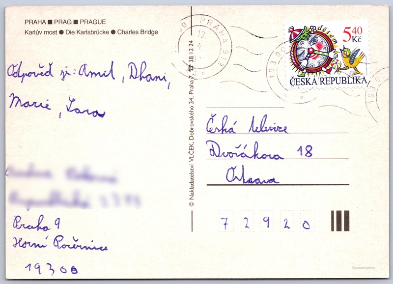 Praha, Karlův most Pokud chcete vidět pohlednice ve vyšším rozlišení nebo zobrazovat jejich zadní stranu, tak se prosím nejdříve přihlašte Přihlásit Zaregistrovat PRAHA - PRAG - PRAGUEKarlův most - Die Karlsbrücke - Charles Bridge Jazyky tištěného textu na pohlednici: čeština, němčina, angličtina Vydavatel: Nakladatelství VLČEK (Česko) Odhadované datum vydání pohlednice: 1998 - 2001 Pomozte nám zpřesnit rok vzniku pohlednice Velikost (š x v) a tvar pohlednice: 148 x 105 mm (5.83" x 4.13"), obdélník Prošlá poštou:Datum na razítku: 13.4.2001 Ceny: Vyplacené známky: 5,40 Kč (CZK) DiskuseVložit příspěvek Přidat novou složku ... Spravovat složky ...