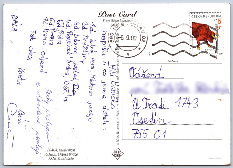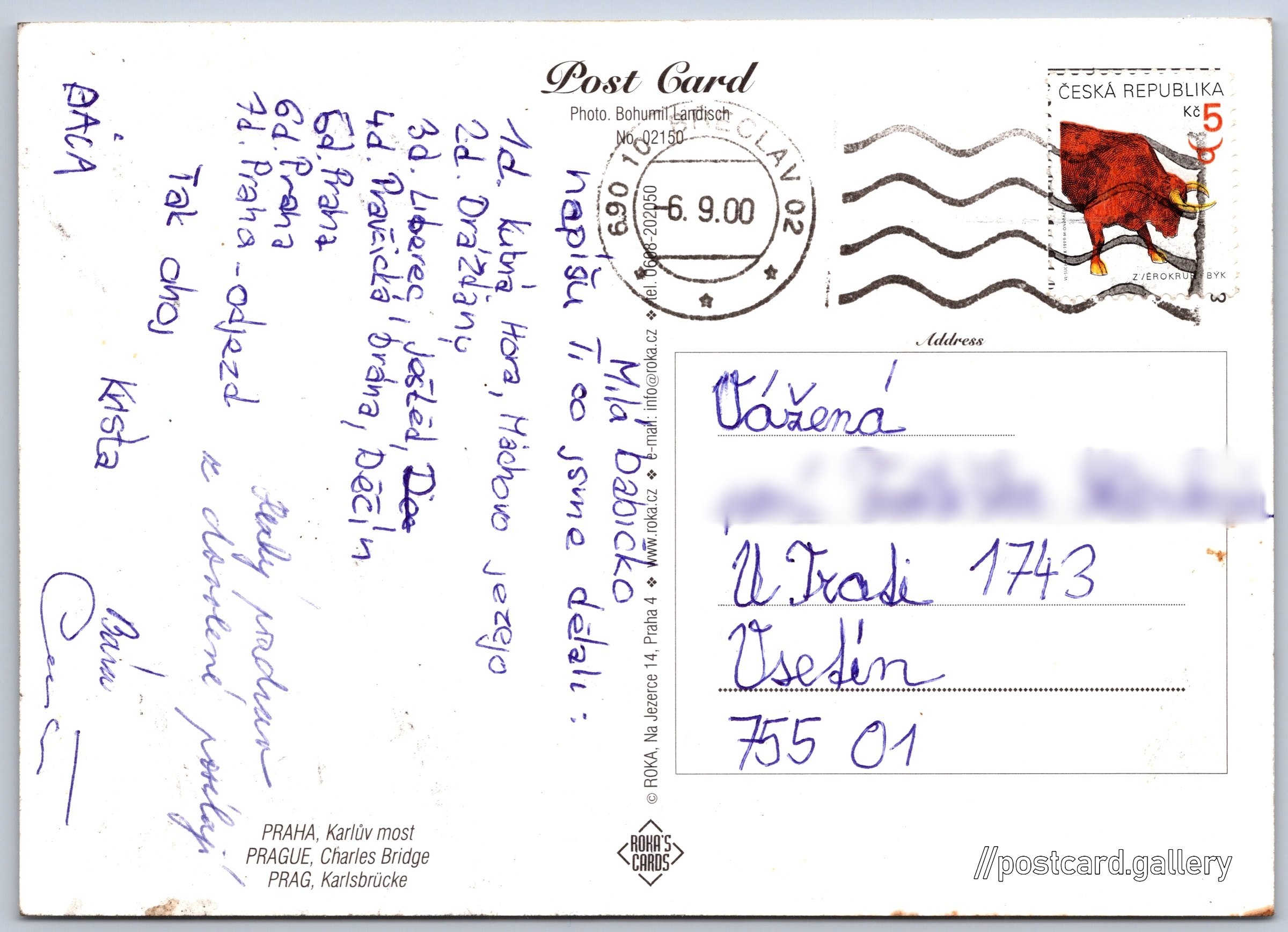Praha, Karlův most Pokud chcete vidět pohlednice ve vyšším rozlišení nebo zobrazovat jejich zadní stranu, tak se prosím nejdříve přihlašte Přihlásit Zaregistrovat Karlův mostPraha PRAHA, Karlův mostPRAGUE, Charles BridgePRAG, Karlsbrücke Jazyky tištěného textu na pohlednici: čeština, angličtina, němčina Karlův most, Praha, Hlavní město Praha ukázat na mapě Vydavatel: ROKA (Česko) Odhadované datum vydání pohlednice: 1997 - 2000 Pomozte nám zpřesnit rok vzniku pohlednice Velikost (š x v) a tvar pohlednice: 147 x 106 mm (5.79" x 4.17"), obdélník Osoby spjaté s touto pohlednicí: Bohumil Landisch(Autor fotografie) Prošlá poštou:Datum na razítku: 6.9.2000 Ceny: Vyplacené známky: 5,00 Kč (CZK) Kódy na pohlednici: 02150 DiskuseVložit příspěvek Přidat novou složku ... Spravovat složky ...