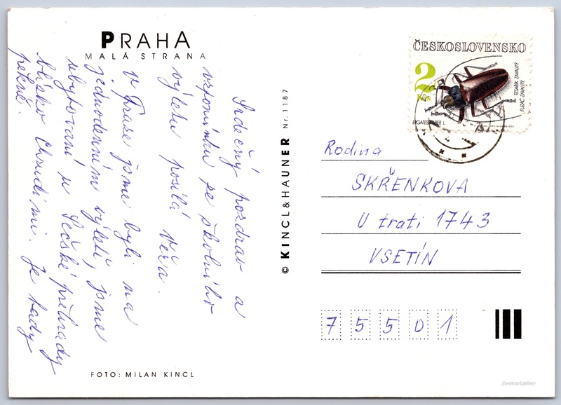 Praha, Malá strana Pokud chcete vidět pohlednice ve vyšším rozlišení nebo zobrazovat jejich zadní stranu, tak se prosím nejdříve přihlašte Přihlásit Zaregistrovat PrahaMalá strana PRAHAMALÁ STRANA Jazyk tištěného textu na pohlednici: čeština Malá Strana, Část obce, Praha, Česko ukázat na mapě Vydavatel: Kincl & Hauner (Česko) Datum vydání není známo Pomozte nám odhadnout datum vzniku pohlednice Velikost (š x v) a tvar pohlednice: 147 x 105 mm (5.79" x 4.13"), obdélník Osoby spjaté s touto pohlednicí: Milan Kincl(Autor fotografie) Prošlá poštou Ceny: Vyplacené známky: 2,00 Kč (CZK) Kódy na pohlednici: 1187 DiskuseVložit příspěvek Přidat novou složku ... Spravovat složky ...