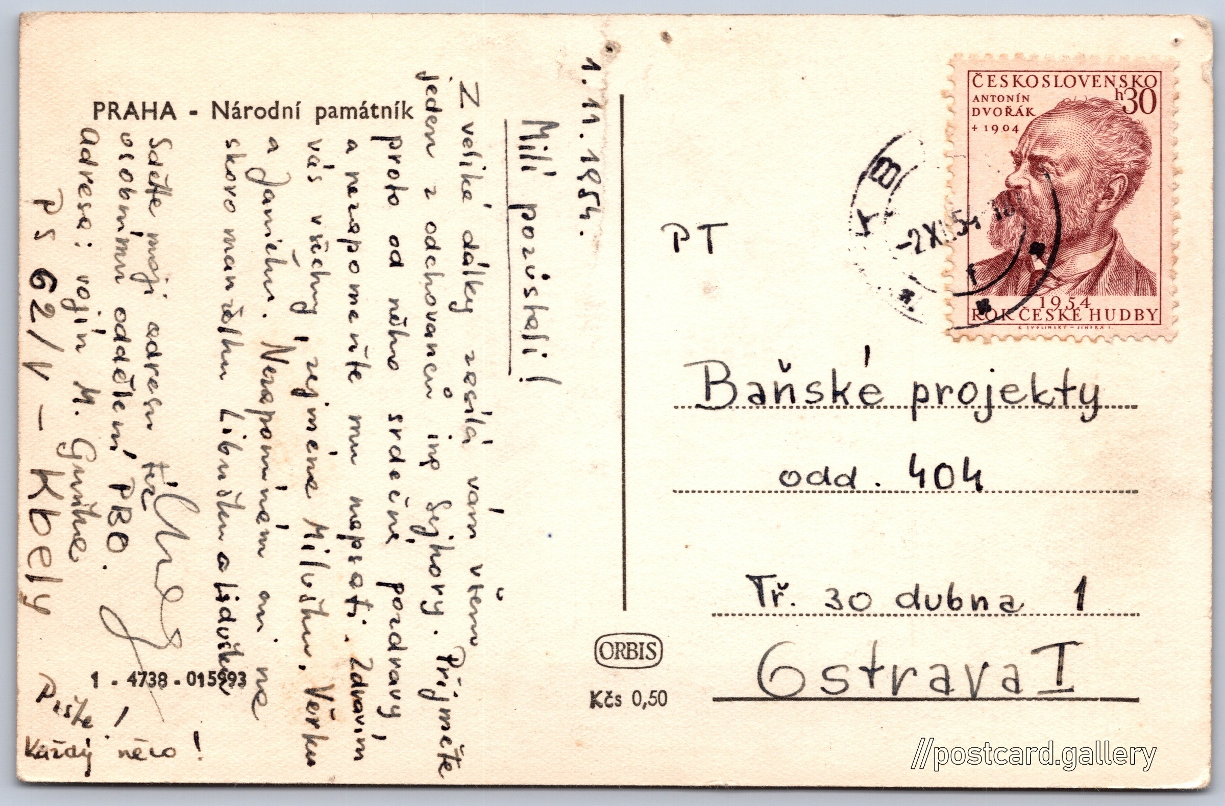 Praha, Národní památník Pokud chcete vidět pohlednice ve vyšším rozlišení nebo zobrazovat jejich zadní stranu, tak se prosím nejdříve přihlašte Přihlásit Zaregistrovat PRAHA - Národní památník Jazyk tištěného textu na pohlednici: čeština Národní památník na Vítkově, Muzeum, U památníku 1900, Praha 3 - Žižkov, Česko ukázat na mapě V blízkém okolí místa zobrazeného na pohlednici lze najít 159 jiných pohlednic. Zobrazit blízké pohlednice Vydavatel: Nakladatelství Orbis (Československo) Odhadované datum vydání pohlednice: 1953 - 1954 Pomozte nám zpřesnit rok vzniku pohlednice Velikost (š x v) a tvar pohlednice: 138 x 90 mm (5.43" x 3.54"), obdélník Prošlá poštou:Datum na razítku: 2.12.1954Datum napsání pohledu: 1.11.1954 Ceny: Cena pohlednice: 0,50 Kčs (CSK)Vyplacené známky: 0,30 Kčs (CSK) Kódy na pohlednici: 1-4738 015993 DiskuseVložit příspěvek Přidat novou složku ... Spravovat složky ...