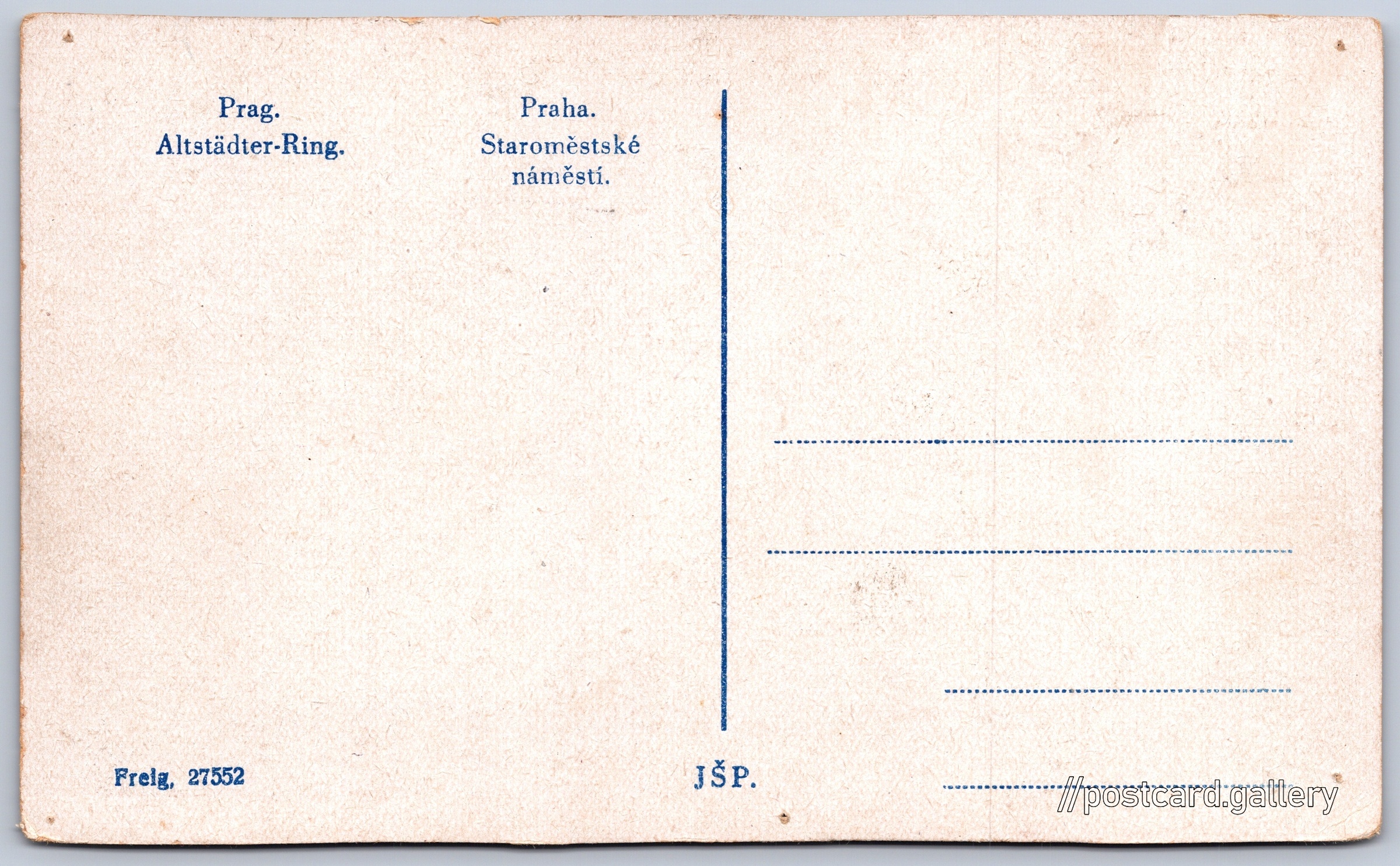 Praha, Staroměstské náměstí Pokud chcete vidět pohlednice ve vyšším rozlišení nebo zobrazovat jejich zadní stranu, tak se prosím nejdříve přihlašte Přihlásit Zaregistrovat Prag. Altstädter-Ring.Praha. Staroměstské náměstí. Jazyky tištěného textu na pohlednici: němčina, čeština Pařížská, Praha, Hlavní město Praha ukázat na mapě V blízkém okolí místa zobrazeného na pohlednici lze najít 159 jiných pohlednic. Zobrazit blízké pohlednice Vydavatel: J Š P (Československo) Datum vydání není známo Pomozte nám odhadnout datum vzniku pohlednice Velikost (š x v) a tvar pohlednice: 139 x 85 mm (5.47" x 3.35"), obdélník Čistá pohlednice (neprošlá poštou) Kódy na pohlednici: Freig. 27552 DiskuseVložit příspěvek Přidat novou složku ... Spravovat složky ...