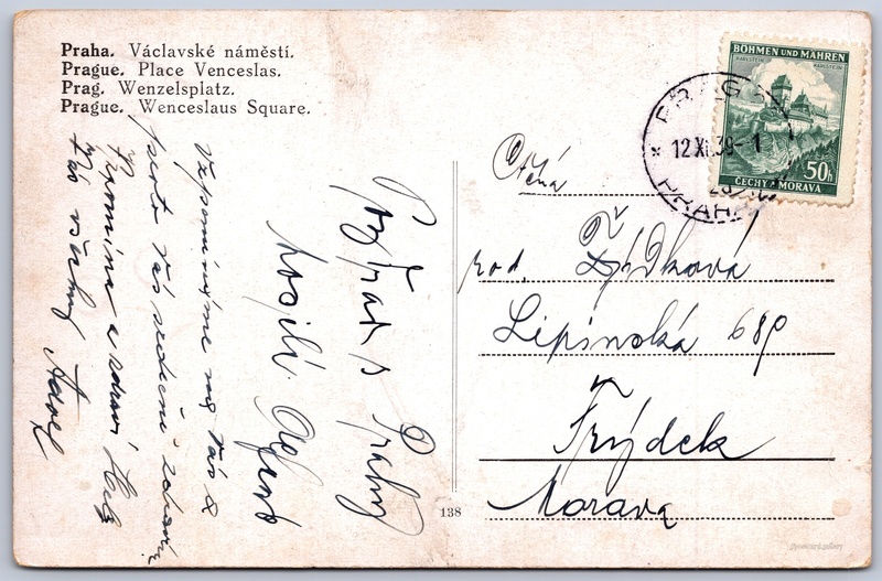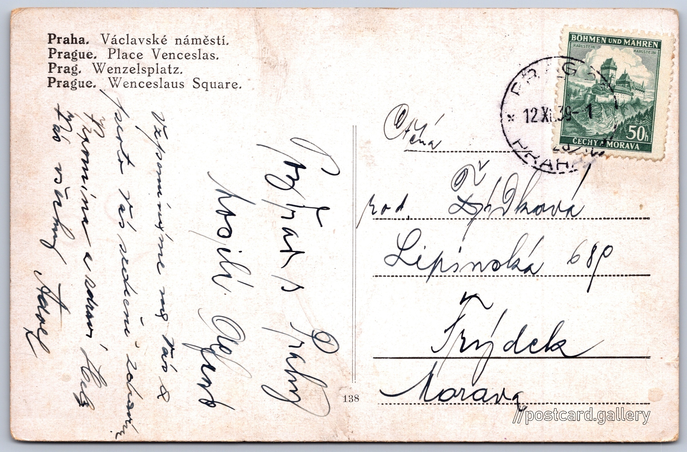 Praha, Václavské náměstí Pokud chcete vidět pohlednice ve vyšším rozlišení nebo zobrazovat jejich zadní stranu, tak se prosím nejdříve přihlašte Přihlásit Zaregistrovat Praha. Václavské náměstí.Prague, Place Venceslas.Prag. Wenzelsplatz.Prague. Wenceslaus Square. Jazyky tištěného textu na pohlednici: čeština, francouzština, němčina, angličtina Václavské náměstí, Praha, Hlavní město Praha ukázat na mapě Odhadované datum vydání pohlednice: 1936 - 1939 Pomozte nám zpřesnit rok vzniku pohlednice Velikost (š x v) a tvar pohlednice: 139 x 90 mm (5.47" x 3.54"), obdélník Prošlá poštou:Datum na razítku: 12.11.1939 Ceny: Vyplacené známky: 0,50 Kčs (CSK) Kódy na pohlednici: 138 DiskuseVložit příspěvek Přidat novou složku ... Spravovat složky ...