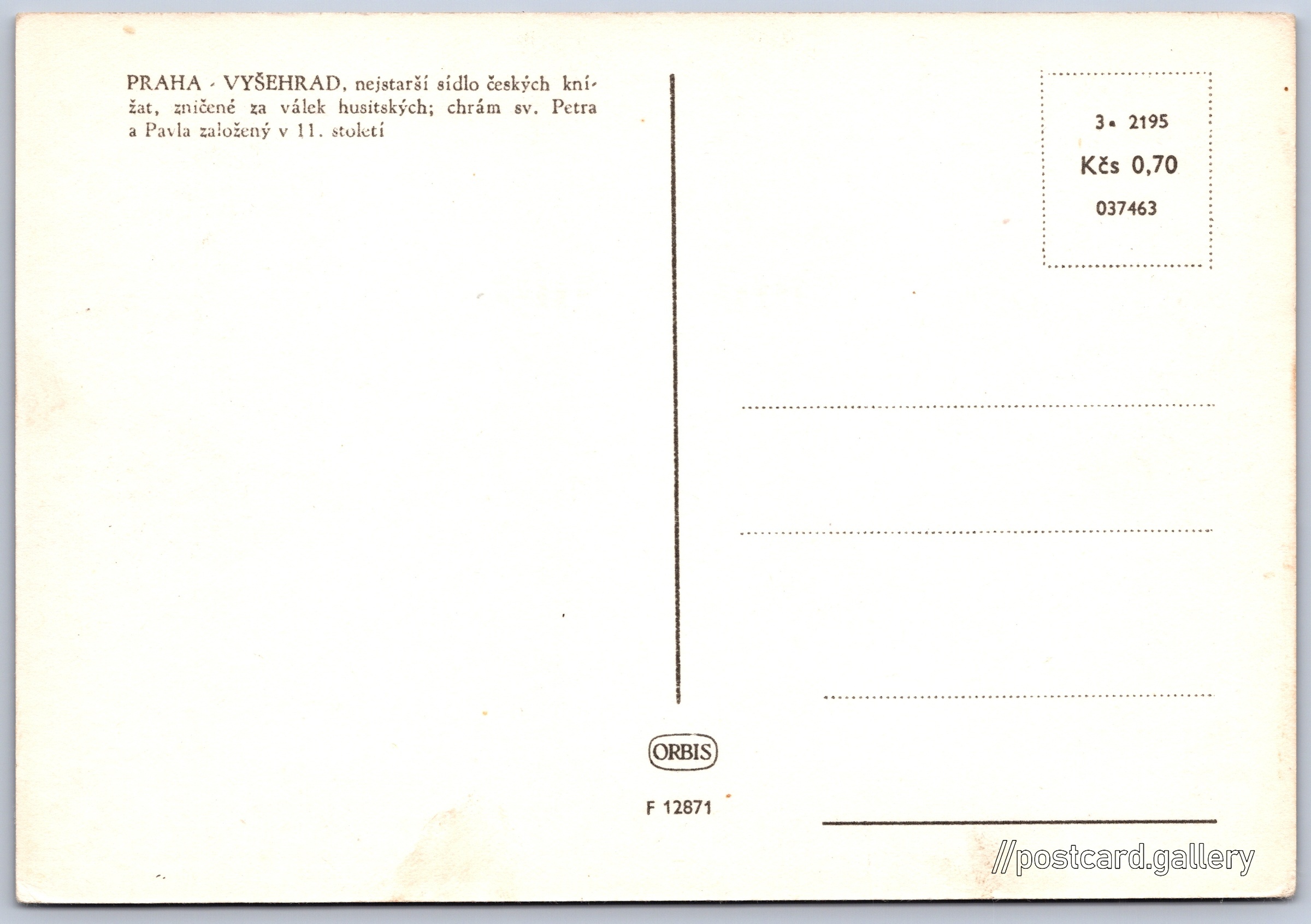 Praha, Vyšehrad Pokud chcete vidět pohlednice ve vyšším rozlišení nebo zobrazovat jejich zadní stranu, tak se prosím nejdříve přihlašte Přihlásit Zaregistrovat PRAHA - VYŠEHRAD, nejstarší sídlo českých knížat, zničené za válek husitských; chrám sv. Petra a Pavla založený v 11. století Jazyk tištěného textu na pohlednici: čeština Vyšehrad, Část obce, Praha, Česko ukázat na mapě V blízkém okolí místa zobrazeného na pohlednici lze najít 158 jiných pohlednic. Zobrazit blízké pohlednice Vydavatel: Nakladatelství Orbis (Československo) Datum vydání není známo Pomozte nám odhadnout datum vzniku pohlednice Velikost (š x v) a tvar pohlednice: 147 x 101 mm (5.79" x 3.98"), obdélník Čistá pohlednice (neprošlá poštou) Ceny: Cena pohlednice: 0,70 Kčs (CSK) Kódy na pohlednici: 3-2195 037463 F 12871 DiskuseVložit příspěvek Přidat novou složku ... Spravovat složky ...