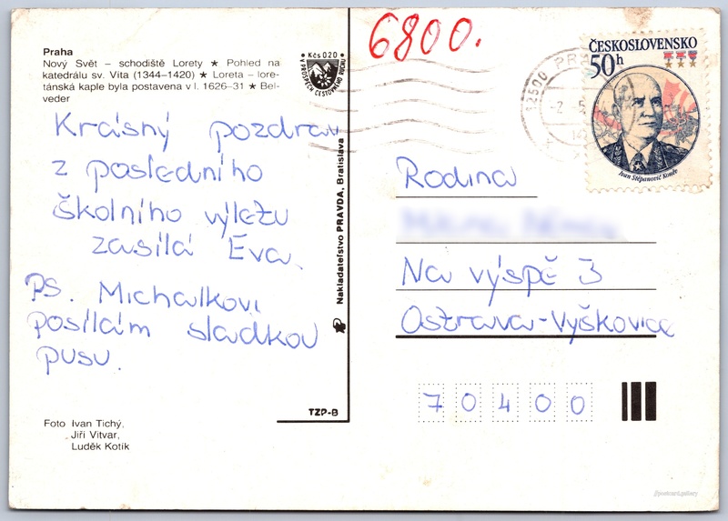 Praha Pokud chcete vidět pohlednice ve vyšším rozlišení nebo zobrazovat jejich zadní stranu, tak se prosím nejdříve přihlašte Přihlásit Zaregistrovat Praha Praha- Nový Svět - schodiště Lorety- Pohled na katedrálu sv. Víta (1344-1420)- Loreta - loretánská kaple byla postavena v l. 1626–31- Belveder Jazyk tištěného textu na pohlednici: čeština Loretánské náměstí 100/7, Praha, 118 00, Hlavní město Praha ukázat na mapě Vydavatel: Nakladateľstvo PRAVDA, Bratislava (Československo) Odhadované datum vydání pohlednice: 1981 - 1984 Pomozte nám zpřesnit rok vzniku pohlednice Velikost (š x v) a tvar pohlednice: 149 x 105 mm (5.87" x 4.13"), obdélník Osoby spjaté s touto pohlednicí: Ivan Tichý(Autor fotografie) Luděk Kotík(Autor fotografie) Jiří Vitvar(Autor fotografie) Prošlá poštou:Datum na razítku: 2.5.1984 Ceny: Příplatek na tur. ruch: 0,20 Kčs (CSK))Vyplacené známky: 0,50 Kčs (CSK) DiskuseVložit příspěvek Přidat novou složku ... Spravovat složky ...