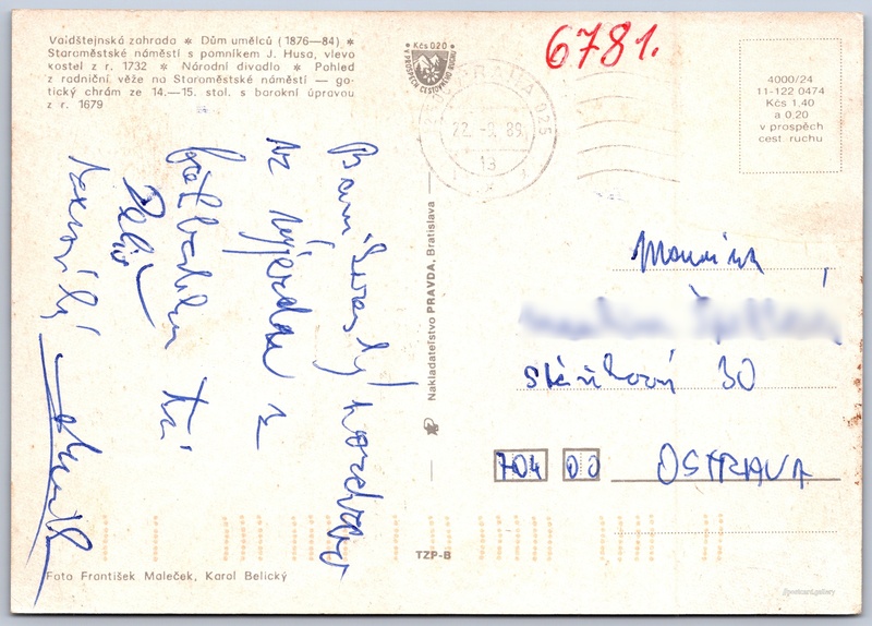 Praha Pokud chcete vidět pohlednice ve vyšším rozlišení nebo zobrazovat jejich zadní stranu, tak se prosím nejdříve přihlašte Přihlásit Zaregistrovat Praha - Valdštejnská zahrada- Dům umělců (1876-84)- Staroměstské náměstí s pomníkem J. Husa, vlevo kostel z r. 1732- Národní divadlo- Pohled z radniční věže na Staroměstské náměstí - gotický chrám ze 14.-15. stol. s barokní úpravou z r. 1679 Jazyk tištěného textu na pohlednici: čeština Praha 1, Praha, Hlavní město Praha ukázat na mapě Vydavatel: Nakladateľstvo PRAVDA, Bratislava (Československo) Rok vydání pohlednice: duben, 1974 Velikost (š x v) a tvar pohlednice: 149 x 105 mm (5.87" x 4.13"), obdélník Osoby spjaté s touto pohlednicí: Karol Belický(Autor fotografie) František Maleček(Autor fotografie) Jan Hus(Obsah pohlednice) Prošlá poštou:Datum na razítku: 22.9.1989 Ceny: Cena pohlednice: 1,40 Kčs (CSK) (+0,20 Kčs přípl. na tur. ruch) Kódy na pohlednici: 4000/24 11-122 0474 DiskuseVložit příspěvek Přidat novou složku ... Spravovat složky ...