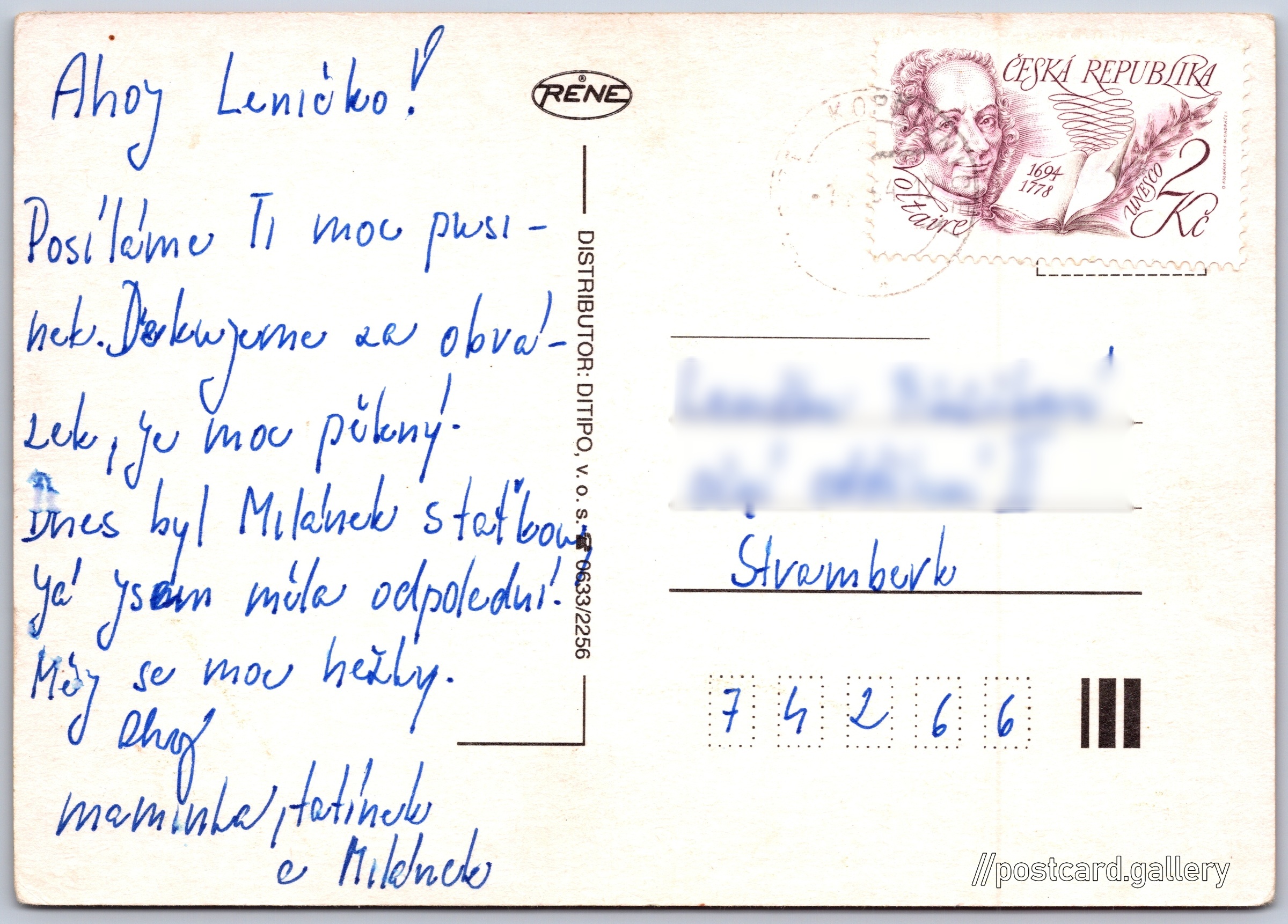 Přání, kreslená kočička Pokud chcete vidět pohlednice ve vyšším rozlišení nebo zobrazovat jejich zadní stranu, tak se prosím nejdříve přihlašte Přihlásit Zaregistrovat Jazyk tištěného textu na pohlednici: čeština Vydavatel: Ditipo (Česko)RENE (Česko) Odhadované datum vydání pohlednice: 1993 - 1994 Pomozte nám zpřesnit rok vzniku pohlednice Velikost (š x v) a tvar pohlednice: 148 x 105 mm (5.83" x 4.13"), obdélník Prošlá poštou Ceny: Vyplacené známky: 2,00 Kč (CZK) DiskuseVložit příspěvek Přidat novou složku ... Spravovat složky ...