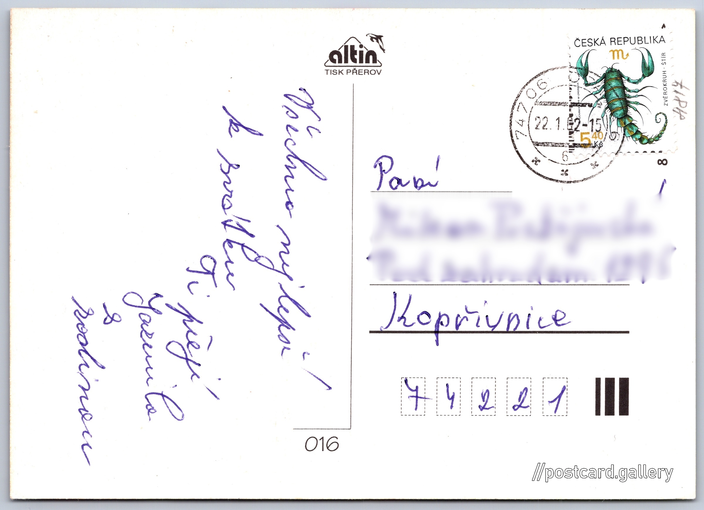 Přání všeho nejlepšího Pokud chcete vidět pohlednice ve vyšším rozlišení nebo zobrazovat jejich zadní stranu, tak se prosím nejdříve přihlašte Přihlásit Zaregistrovat Vše nej ... Jazyk tištěného textu na pohlednici: čeština Vydavatel: altin, Tisk Přerov (Česko) Odhadované datum vydání pohlednice: 1999 - 2002 Pomozte nám zpřesnit rok vzniku pohlednice Velikost (š x v) a tvar pohlednice: 145 x 103 mm (5.71" x 4.06"), obdélník Prošlá poštou:Datum na razítku: 22.1.2002 Ceny: Vyplacené známky: 5,40 Kč (CZK) Kódy na pohlednici: 016 DiskuseVložit příspěvek Přidat novou složku ... Spravovat složky ...