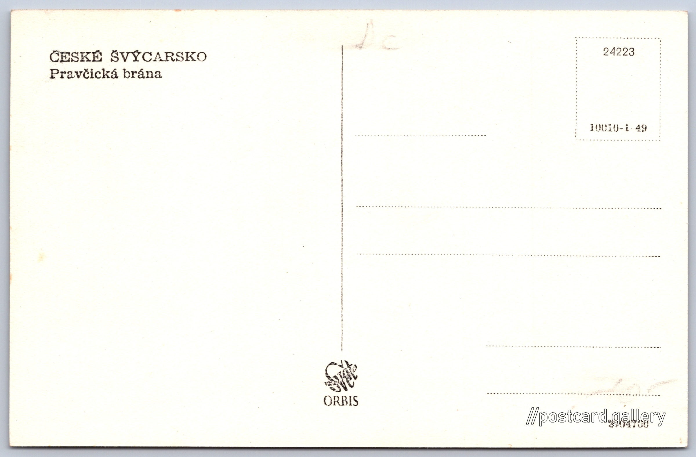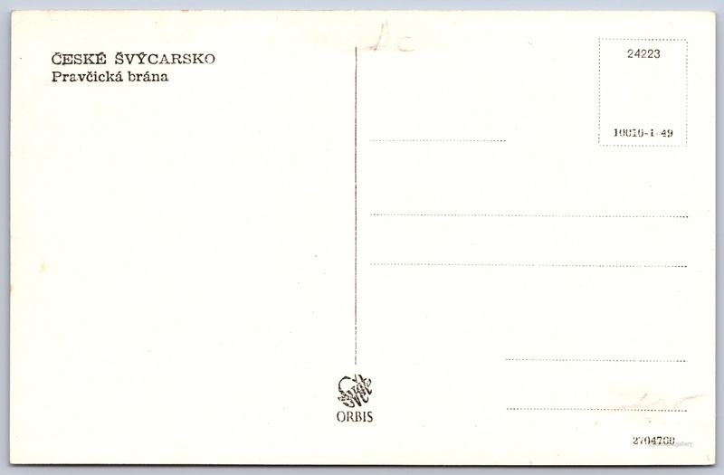 Pravčická brána Pokud chcete vidět pohlednice ve vyšším rozlišení nebo zobrazovat jejich zadní stranu, tak se prosím nejdříve přihlašte Přihlásit Zaregistrovat ČESKÉ ŠVÝCARSKOPravčická brána Jazyk tištěného textu na pohlednici: čeština Pravčická brána, Skalní útvar, Hřensko, Česko ukázat na mapě V blízkém okolí místa zobrazeného na pohlednici lze najít 29 jiných pohlednic. Zobrazit blízké pohlednice Vydavatel: Nakladatelství Orbis (Československo) Datum vydání není známo Pomozte nám odhadnout datum vzniku pohlednice Velikost (š x v) a tvar pohlednice: 139 x 90 mm (5.47" x 3.54"), obdélník Čistá pohlednice (neprošlá poštou) Kódy na pohlednici: 24223 10010-I-49 2704700 DiskuseVložit příspěvek Přidat novou složku ... Spravovat složky ...