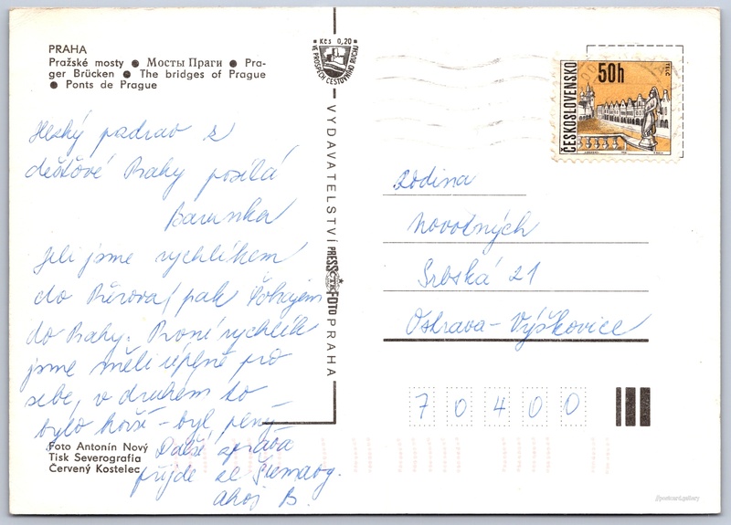 Pražské mosty 3/159 Pokud chcete vidět pohlednice ve vyšším rozlišení nebo zobrazovat jejich zadní stranu, tak se prosím nejdříve přihlašte Přihlásit Zaregistrovat PRAHA PRAHA- Pražské mosty- Мосты Праги- Prager Brücken- The bridges of Prague- Ponts de Prague Jazyky tištěného textu na pohlednici: čeština, ruština, němčina, angličtina, francouzština, francouzština Mánesův most, Praha, Hlavní město Praha ukázat na mapě V blízkém okolí místa zobrazeného na pohlednici lze najít 159 jiných pohlednic. Zobrazit blízké pohlednice Vydavatel: PressFoto Praha (Československo) Datum vydání není známo Pomozte nám odhadnout datum vzniku pohlednice Velikost (š x v) a tvar pohlednice: 147 x 104 mm (5.79" x 4.09"), obdélník Osoby spjaté s touto pohlednicí: Antonín E. Nový(Autor fotografie) Prošlá poštou Ceny: Příplatek na tur. ruch: 0,20 Kčs (CSK))Vyplacené známky: 0,50 Kčs (CSK) DiskuseVložit příspěvek Přidat novou složku ... Spravovat složky ...