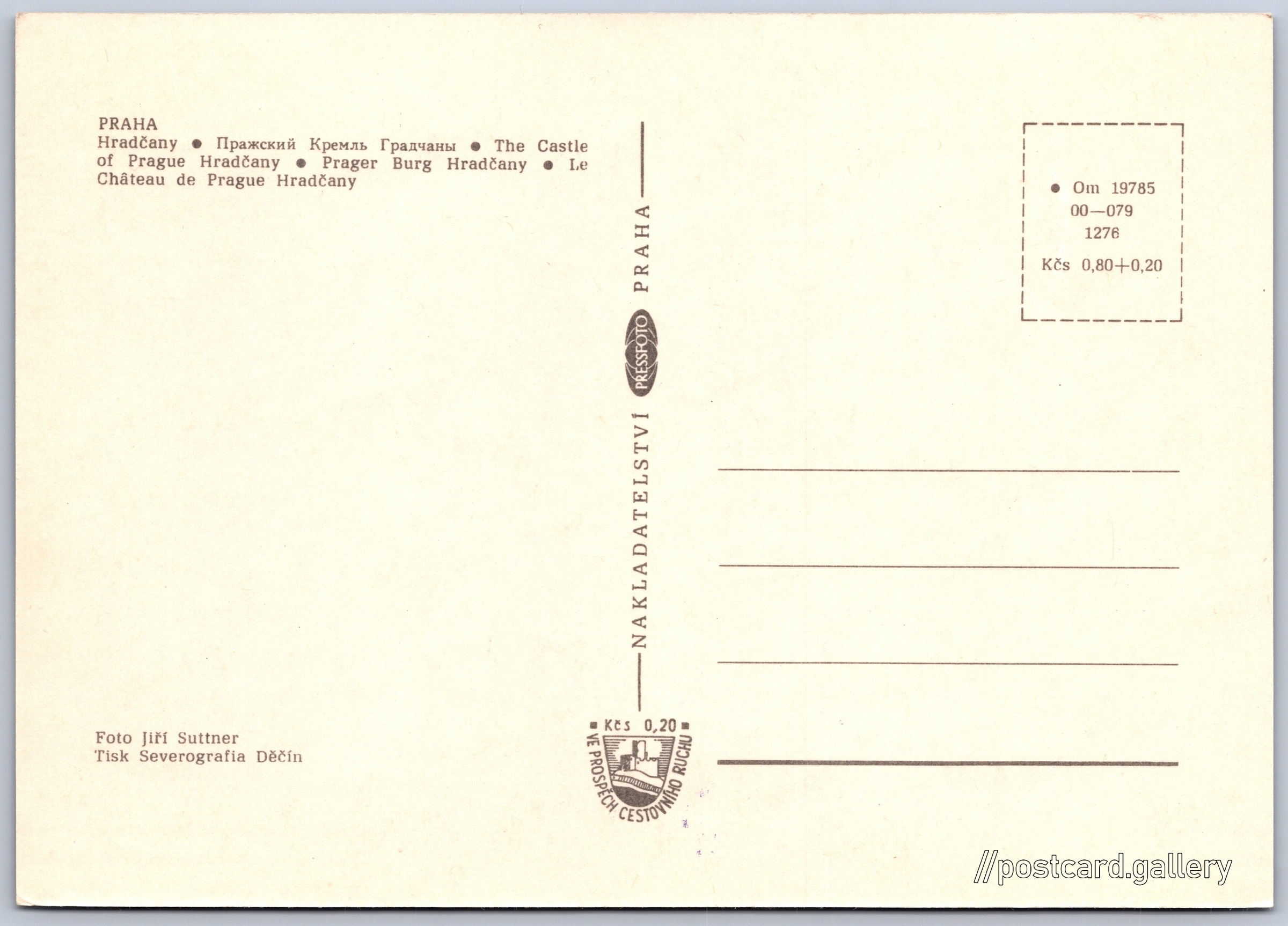Pražský hrad v noci Pokud chcete vidět pohlednice ve vyšším rozlišení nebo zobrazovat jejich zadní stranu, tak se prosím nejdříve přihlašte Přihlásit Zaregistrovat PRAHA- Hradčany- Пражский Кремль Градчаны- The Castle of Prague Hradčany- Prager Burg Hradčany- Le Château de Prague Hradčany Jazyky tištěného textu na pohlednici: čeština, ruština, angličtina, němčina, francouzština, francouzština Pražský hrad, Hrad, Hrad III. nádvoří, Praha, Česko ukázat na mapě V blízkém okolí místa zobrazeného na pohlednici lze najít 159 jiných pohlednic. Zobrazit blízké pohlednice Vydavatel: PressFoto Praha (Československo) Rok vydání pohlednice: 1970 Velikost (š x v) a tvar pohlednice: 147 x 104 mm (5.79" x 4.09"), obdélník Osoby spjaté s touto pohlednicí: Jiří Suttner(Autor fotografie) Čistá pohlednice (neprošlá poštou) Ceny: Cena pohlednice: 0,80 Kčs (CSK) (+0,20 Kčs přípl. na tur. ruch) Kódy na pohlednici: •Om 19785 00-079 1276 DiskuseVložit příspěvek Přidat novou složku ... Spravovat složky ...