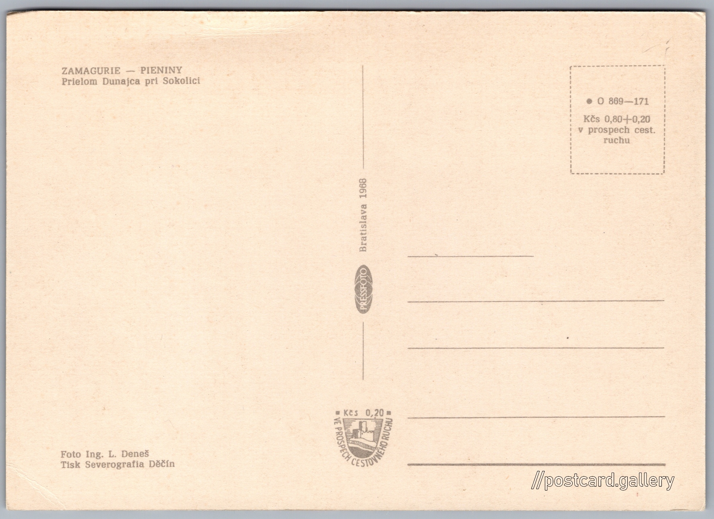 Prielom Dunajca pri Sokolici Pokud chcete vidět pohlednice ve vyšším rozlišení nebo zobrazovat jejich zadní stranu, tak se prosím nejdříve přihlašte Přihlásit Zaregistrovat ZAMAGURIE - PIENINYPrielom Dunajca pri Sokolici Jazyk tištěného textu na pohlednici: slovenština Prielom Dunajca, Informační tabule, Červený Kláštor, Slovensko ukázat na mapě V blízkém okolí místa zobrazeného na pohlednici lze najít 7 jiných pohlednic. Zobrazit blízké pohlednice Vydavatel: PressFoto Bratislava (Československo) Rok vydání pohlednice: 1968 Velikost (š x v) a tvar pohlednice: 147 x 105 mm (5.79" x 4.13"), obdélník Osoby spjaté s touto pohlednicí: Ing. Ladislav Deneš(Autor fotografie) Čistá pohlednice (neprošlá poštou) Ceny: Cena pohlednice: 0,80 Kčs (CSK) (+0,20 Kčs přípl. na tur. ruch) Kódy na pohlednici: O 869-171 DiskuseVložit příspěvek Přidat novou složku ... Spravovat složky ...