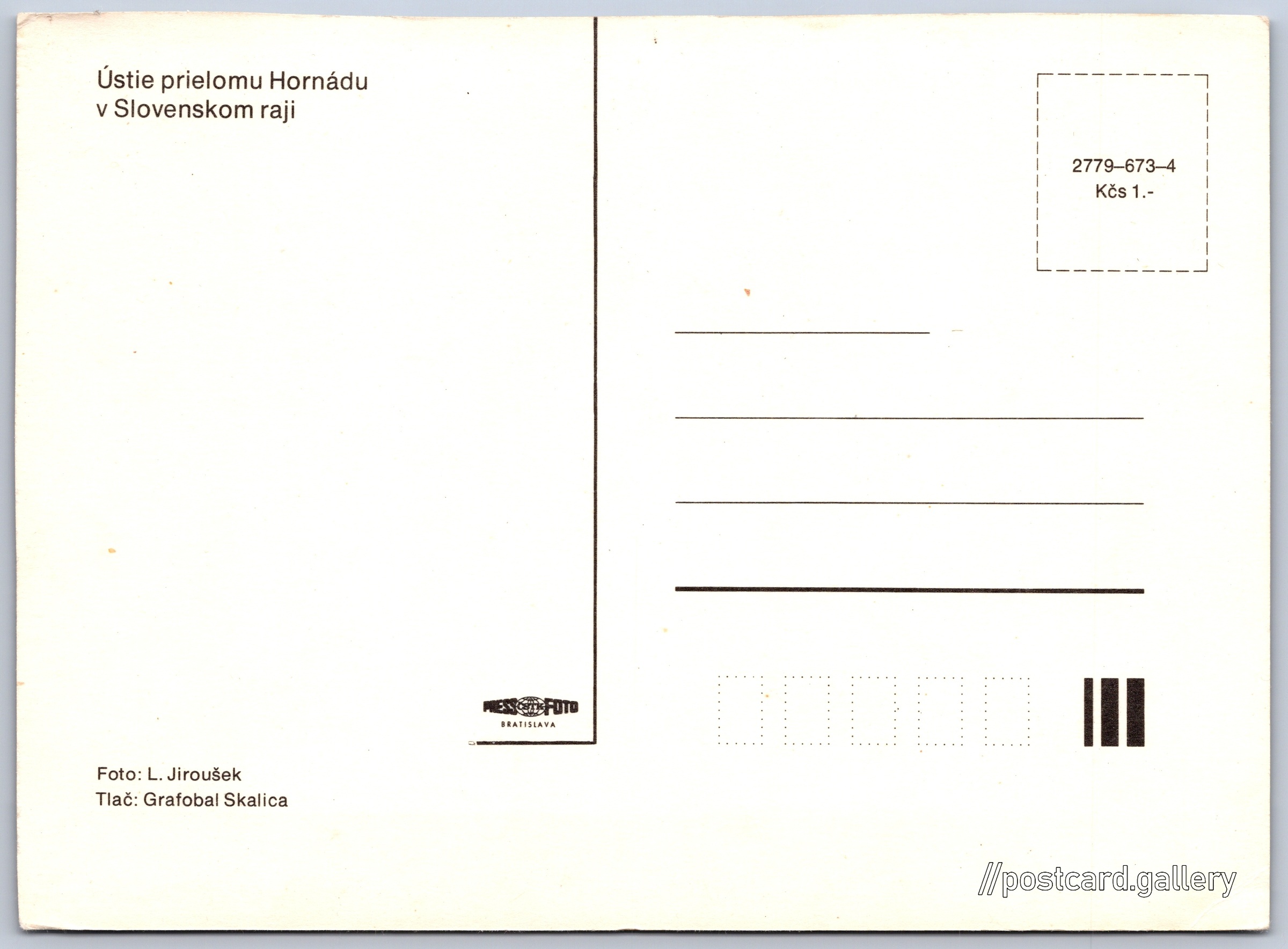 Prielom Hornádu Pokud chcete vidět pohlednice ve vyšším rozlišení nebo zobrazovat jejich zadní stranu, tak se prosím nejdříve přihlašte Přihlásit Zaregistrovat Ústie prielomu Hornádu v Slovenskom raji Jazyk tištěného textu na pohlednici: slovenština Náučný chodník Prielom Hornádu, Turistická trasa, Spišské Tomášovce, Slovensko ukázat na mapě V blízkém okolí místa zobrazeného na pohlednici lze najít 7 jiných pohlednic. Zobrazit blízké pohlednice Vydavatel: PressFoto Bratislava (Československo) Datum vydání není známo Pomozte nám odhadnout datum vzniku pohlednice Velikost (š x v) a tvar pohlednice: 148 x 108 mm (5.83" x 4.25"), obdélník Osoby spjaté s touto pohlednicí: Ladislav Jiroušek(Autor fotografie) Čistá pohlednice (neprošlá poštou) Ceny: Cena pohlednice: 1,00 Kčs (CSK) Kódy na pohlednici: 2779-673-4 DiskuseVložit příspěvek Přidat novou složku ... Spravovat složky ...