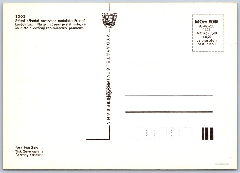 Přírodní rezervace SOOS Pokud chcete vidět pohlednice ve vyšším rozlišení nebo zobrazovat jejich zadní stranu, tak se prosím nejdříve přihlašte Přihlásit Zaregistrovat Státní přírodní rezervace SOOS SOOSStátní přírodní rezervace nedaleko Františkových Lázní. Na jejím území je slatiniště, rašeliniště a vyvěrají zde minerální prameny. Jazyk tištěného textu na pohlednici: čeština Kateřina, Skalná, Cheb ukázat na mapě V blízkém okolí místa zobrazeného na pohlednici lze najít 9 jiných pohlednic. Zobrazit blízké pohlednice Vydavatel: PressFoto Praha (Československo) Rok vydání pohlednice: 1982 Velikost (š x v) a tvar pohlednice: 147 x 105 mm (5.79" x 4.13"), obdélník Osoby spjaté s touto pohlednicí: Petr Zora(Autor fotografie) Čistá pohlednice (neprošlá poštou) Ceny: Cena pohlednice: 1,40 Kčs (CSK) (+0,20 Kčs přípl. na tur. ruch) Kódy na pohlednici: MOm 9045 03-02-289 1441 DiskuseVložit příspěvek Přidat novou složku ... Spravovat složky ...