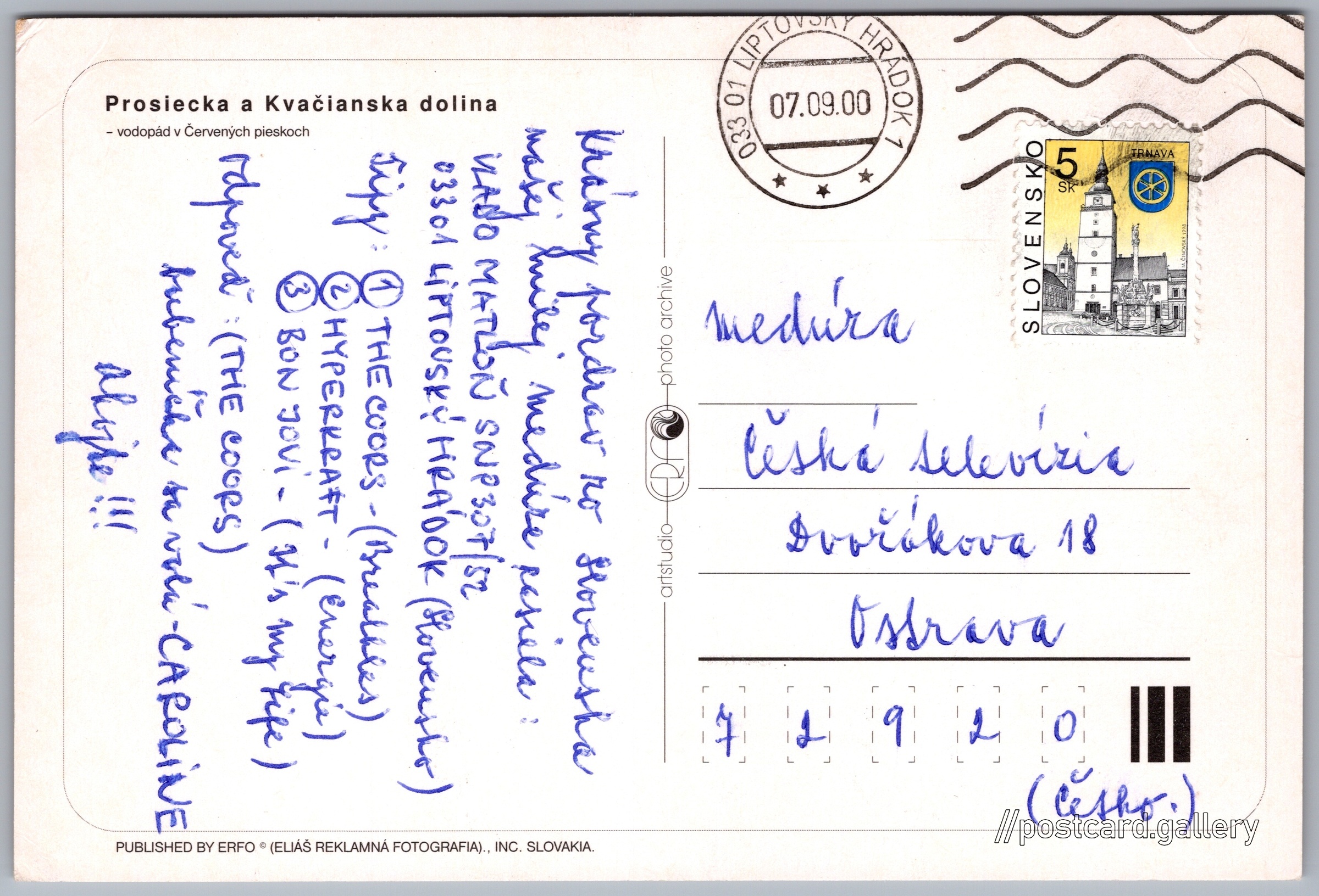 Prosiecka a Kvačianska dolina Pokud chcete vidět pohlednice ve vyšším rozlišení nebo zobrazovat jejich zadní stranu, tak se prosím nejdříve přihlašte Přihlásit Zaregistrovat Prosiecka a Kvačianska dolina Prosiecka a Kvačianska dolina- vodopád v Červených pieskoch Jazyk tištěného textu na pohlednici: slovenština Červené piesky, Vodopád, Prosiek, Slovensko ukázat na mapě V blízkém okolí místa zobrazeného na pohlednici lze najít 3 jiné pohlednice. Zobrazit blízké pohlednice Vydavatel: Artstudio Erfo (Slovensko) Odhadované datum vydání pohlednice: 1997 - 2000 Pomozte nám zpřesnit rok vzniku pohlednice Velikost (š x v) a tvar pohlednice: 152 x 102 mm (5.98" x 4.02"), obdélník Prošlá poštou:Datum na razítku: 7.9.2000 Ceny: Vyplacené známky: 5,00 Sk (SKK) DiskuseVložit příspěvek Přidat novou složku ... Spravovat složky ...