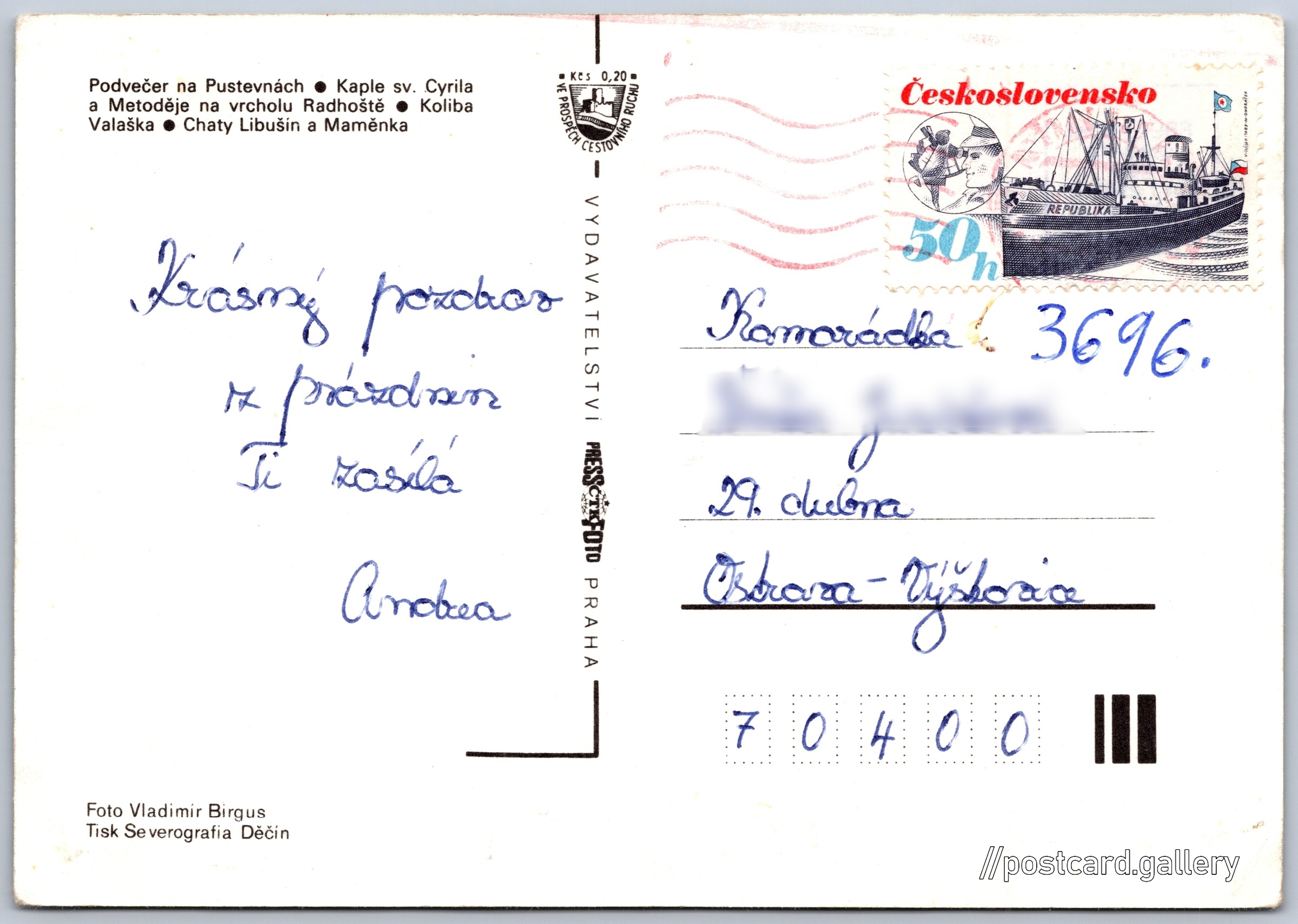 Pustevny, Radhošť Pokud chcete vidět pohlednice ve vyšším rozlišení nebo zobrazovat jejich zadní stranu, tak se prosím nejdříve přihlašte Přihlásit Zaregistrovat Pustevny - Radhošť - Podvečer na Pustevnách- Kaple sv. Cyrila a Metoděje na vrcholu Radhoště- Koliba Valaška- Chaty Libušín a Maměnka Jazyk tištěného textu na pohlednici: čeština Dolní Bečva 28, 756 55 Dolní Bečva, Czechia ukázat na mapě Vydavatel: PressFoto Praha (Československo) Datum vydání není známo Pomozte nám odhadnout datum vzniku pohlednice Velikost (š x v) a tvar pohlednice: 148 x 104 mm (5.83" x 4.09"), obdélník Osoby spjaté s touto pohlednicí: Vladimír Birgus(Autor fotografie) Prošlá poštou Ceny: Příplatek na tur. ruch: 0,20 Kčs (CSK))Vyplacené známky: 0,50 Kčs (CSK) DiskuseVložit příspěvek Přidat novou složku ... Spravovat složky ...