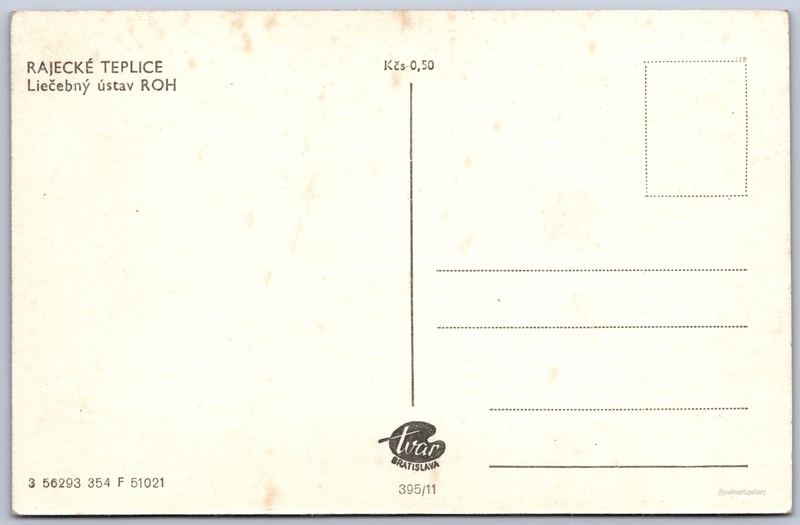 Rajecké Teplice, léčebna ROH Pokud chcete vidět pohlednice ve vyšším rozlišení nebo zobrazovat jejich zadní stranu, tak se prosím nejdříve přihlašte Přihlásit Zaregistrovat RAJECKÉ TEPLICELiečebný ústav ROH Jazyk tištěného textu na pohlednici: slovenština Rajecká cesta 133/24 ukázat na mapě V blízkém okolí místa zobrazeného na pohlednici lze najít 12 jiných pohlednic. Zobrazit blízké pohlednice Vydavatel: Tvar Bratislava (Československo) Rok vydání pohlednice: březen, 1954 Velikost (š x v) a tvar pohlednice: 135 x 87 mm (5.31" x 3.43"), obdélník Čistá pohlednice (neprošlá poštou) Ceny: Cena pohlednice: 0,50 Kčs (CSK) Kódy na pohlednici: 3 56293 354 F 51021 395/11 DiskuseVložit příspěvek Přidat novou složku ... Spravovat složky ...